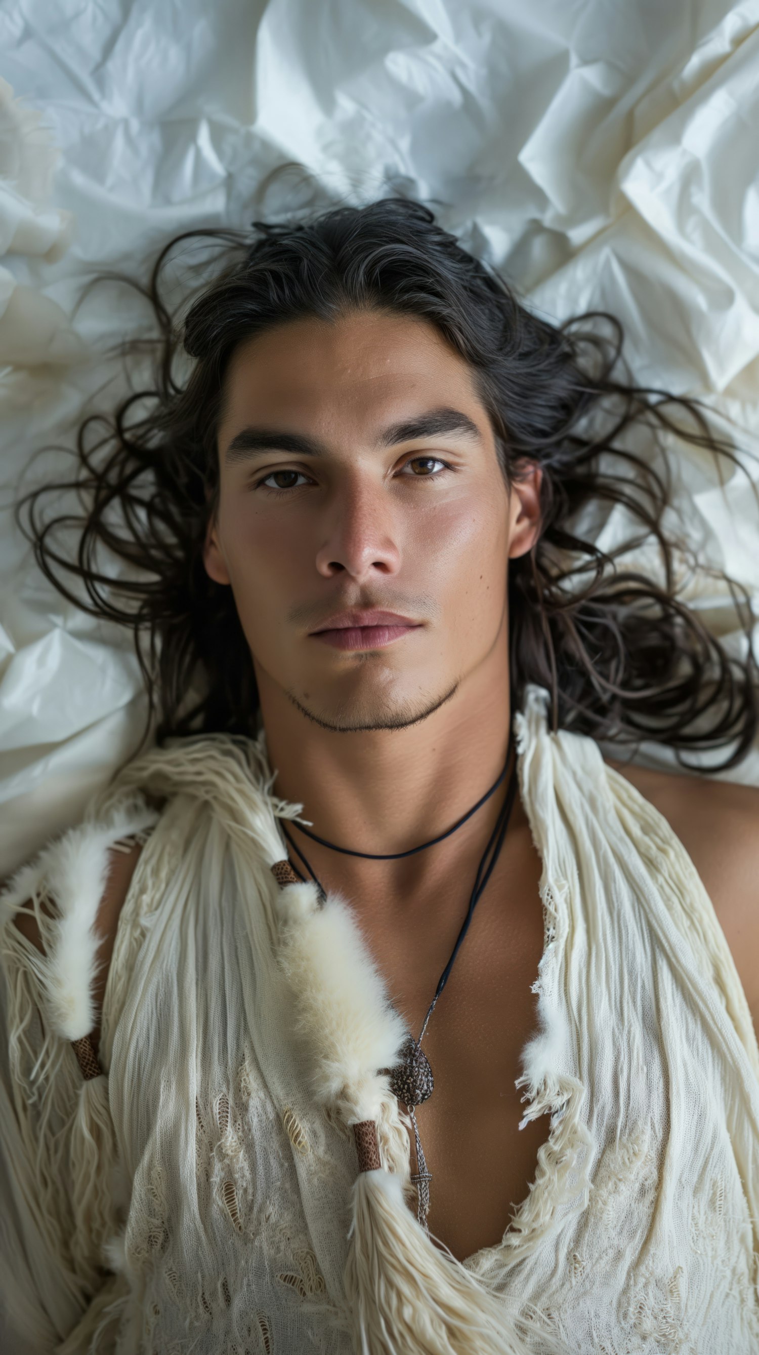 Young man with long dark hair in white textured garment, lying on crumpled fabric, wearing a black necklace. Calm and serene expression.