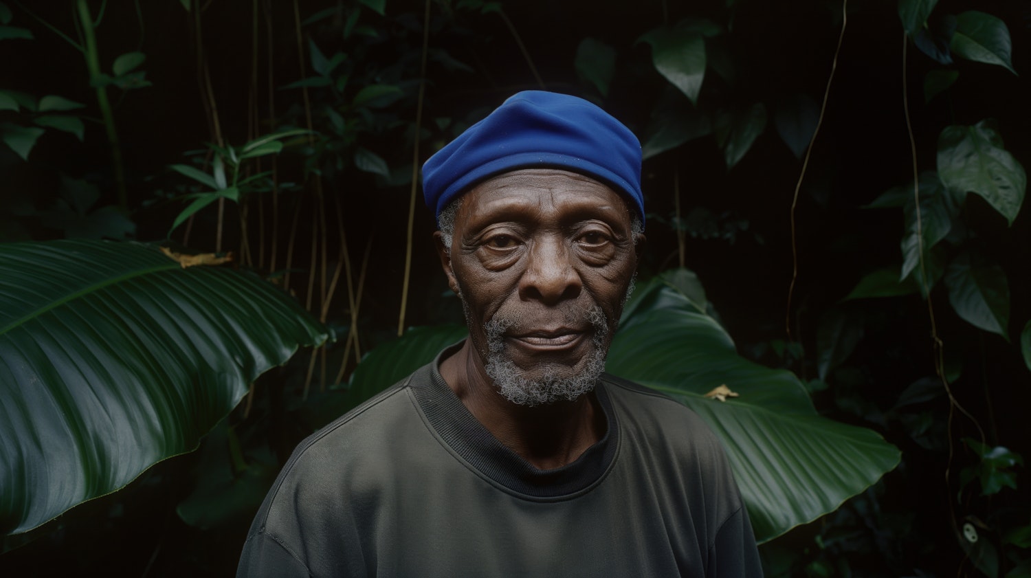 Elderly man with a blue beret amidst lush green foliage, exuding calm and wisdom. Soft lighting highlights his contemplative expression.