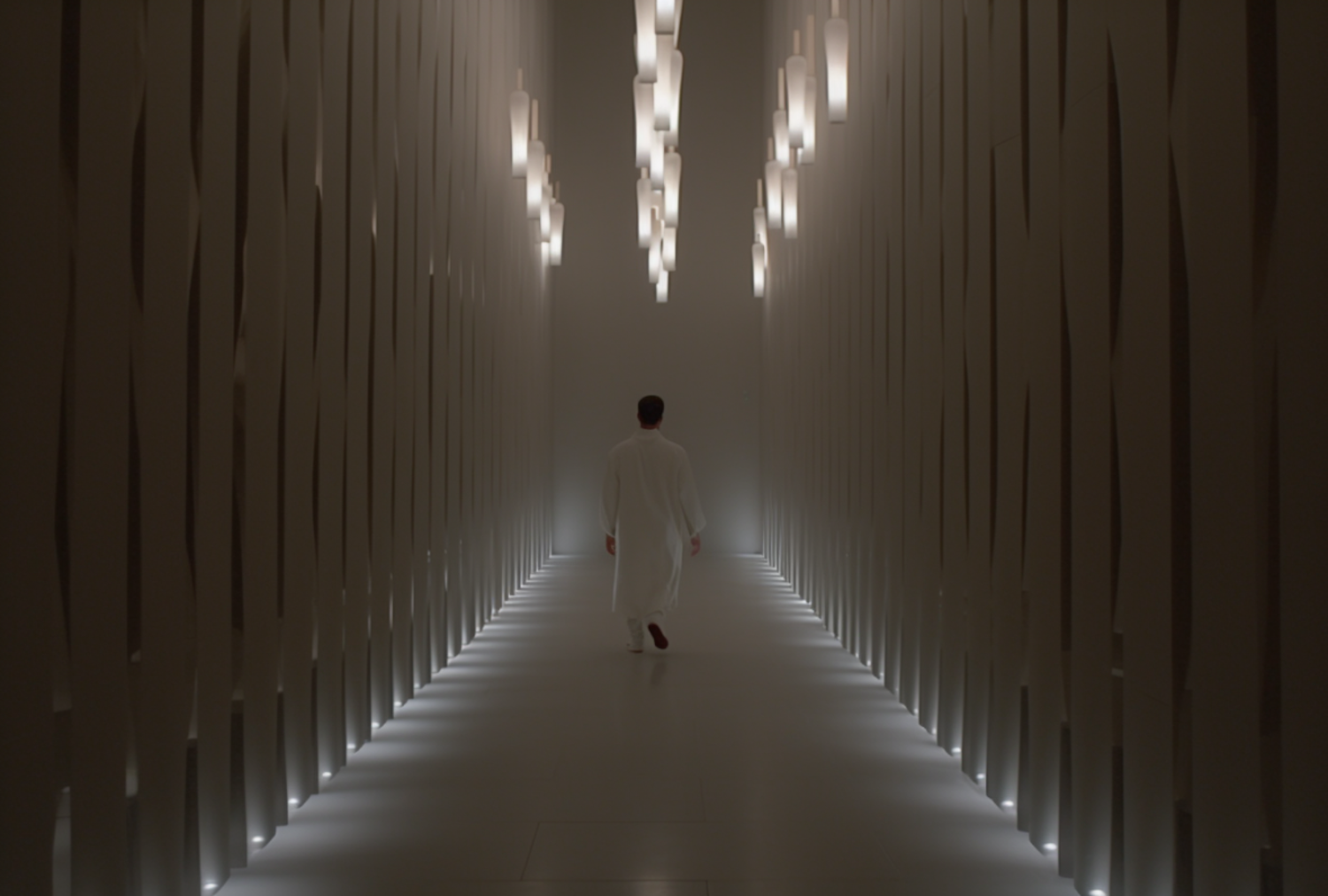 A person in a white robe walks down a futuristic, illuminated corridor with textured walls and modern lighting.