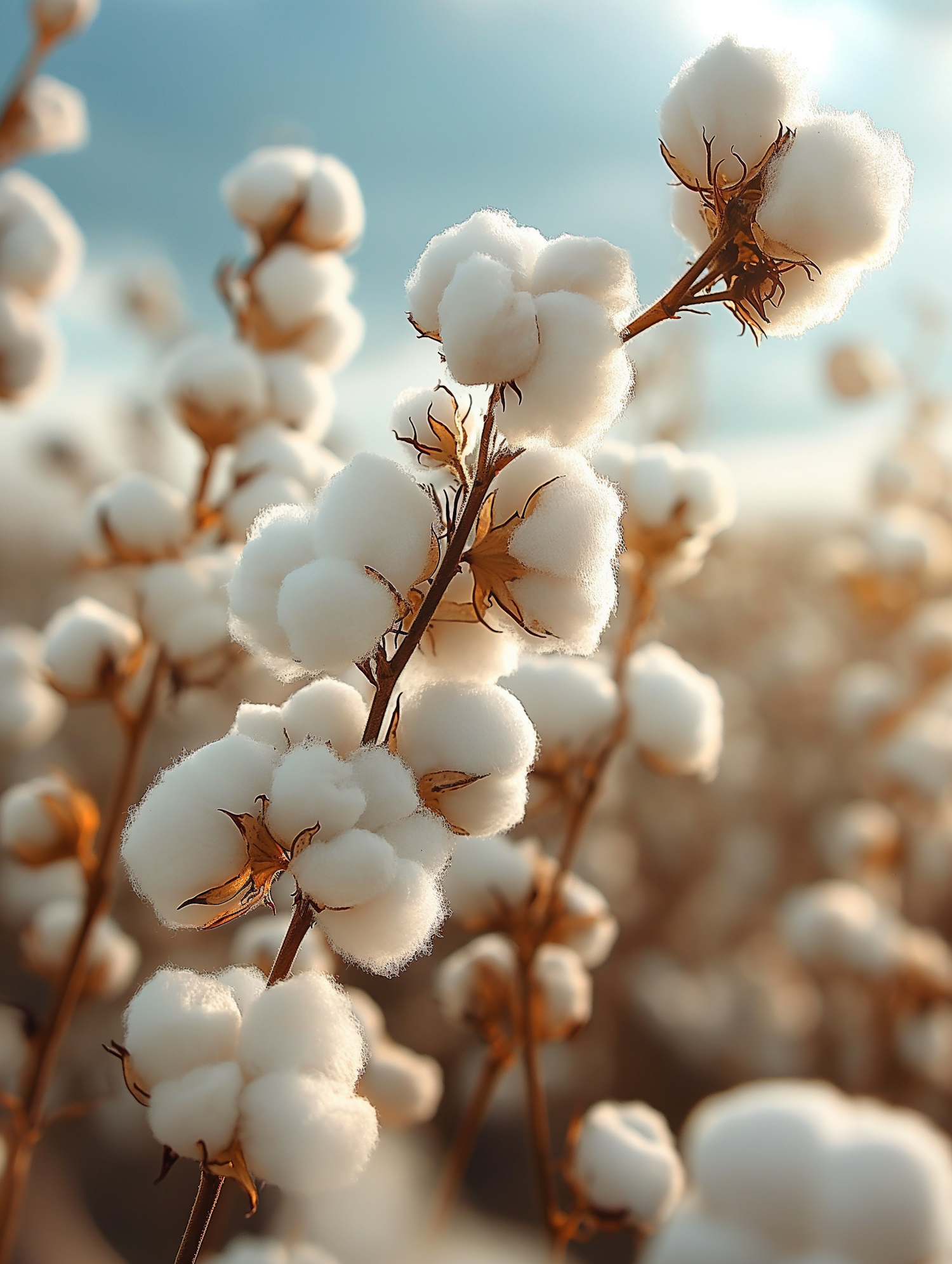 Close-up of fluffy white cotton bolls on brown stems against a soft, sunlit background, highlighting their natural beauty.