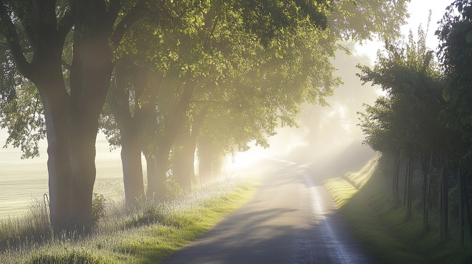Sunlit country road with lush green trees and a misty, ethereal atmosphere, creating a serene and tranquil scene.