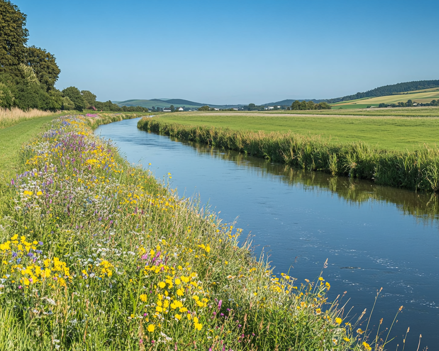 Serene river landscape with vibrant wildflowers and lush green fields under a clear blue sky.