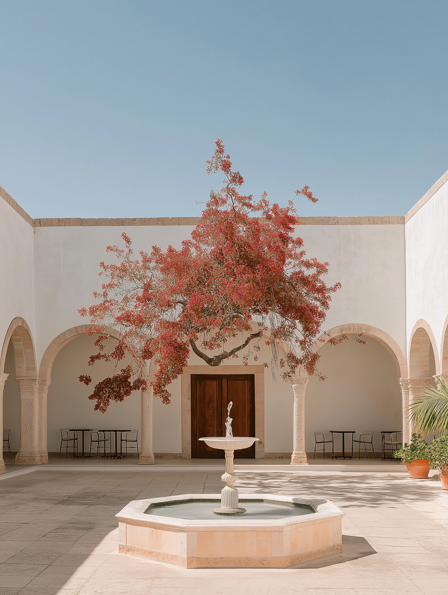 A peaceful courtyard with a red tree, central fountain, arched columns, and clear blue sky. Perfect blend of nature and architecture.