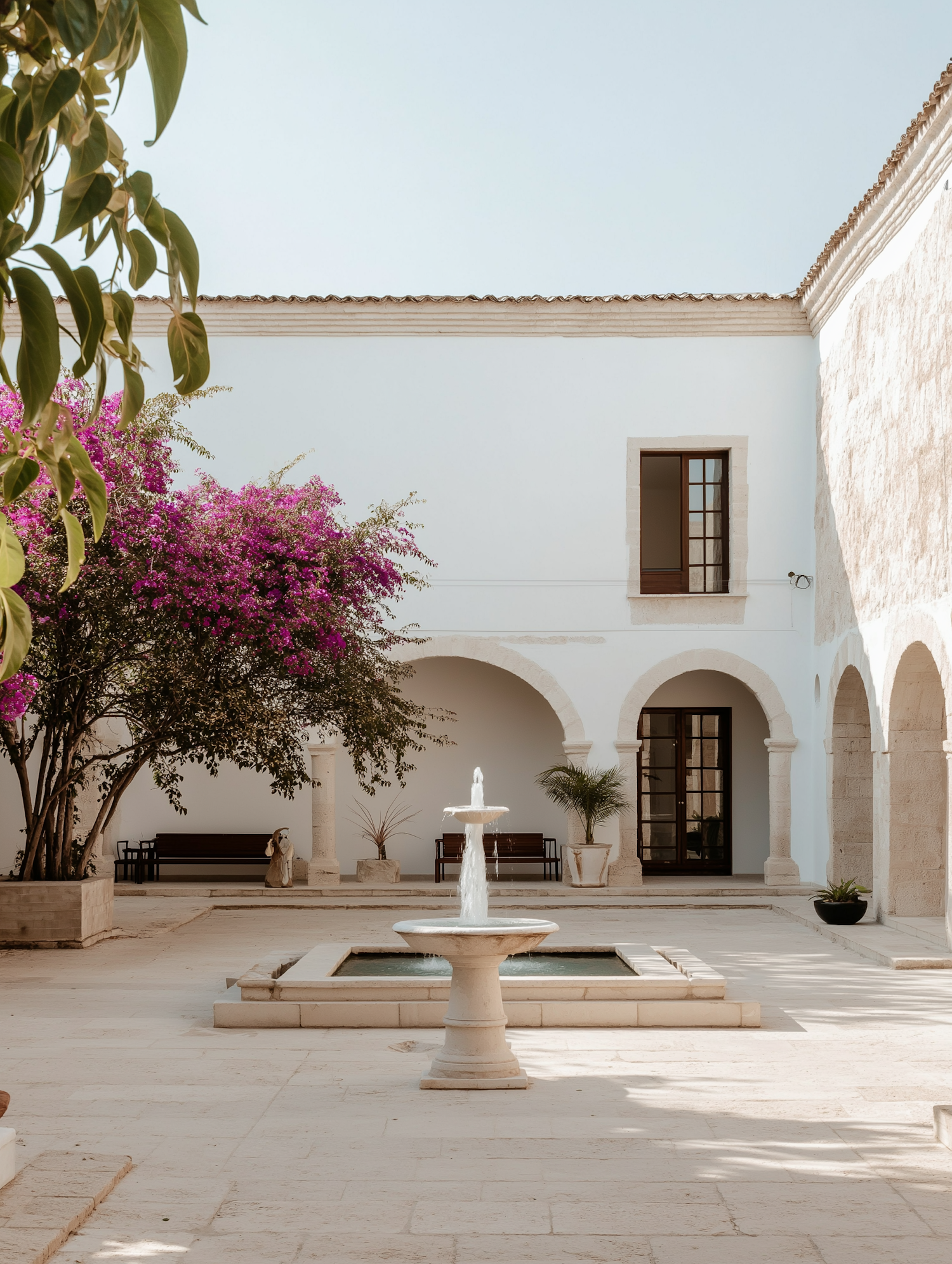 Tranquil courtyard with a stone fountain, bougainvillea tree, and Mediterranean-style arches. Perfect blend of nature and architecture.