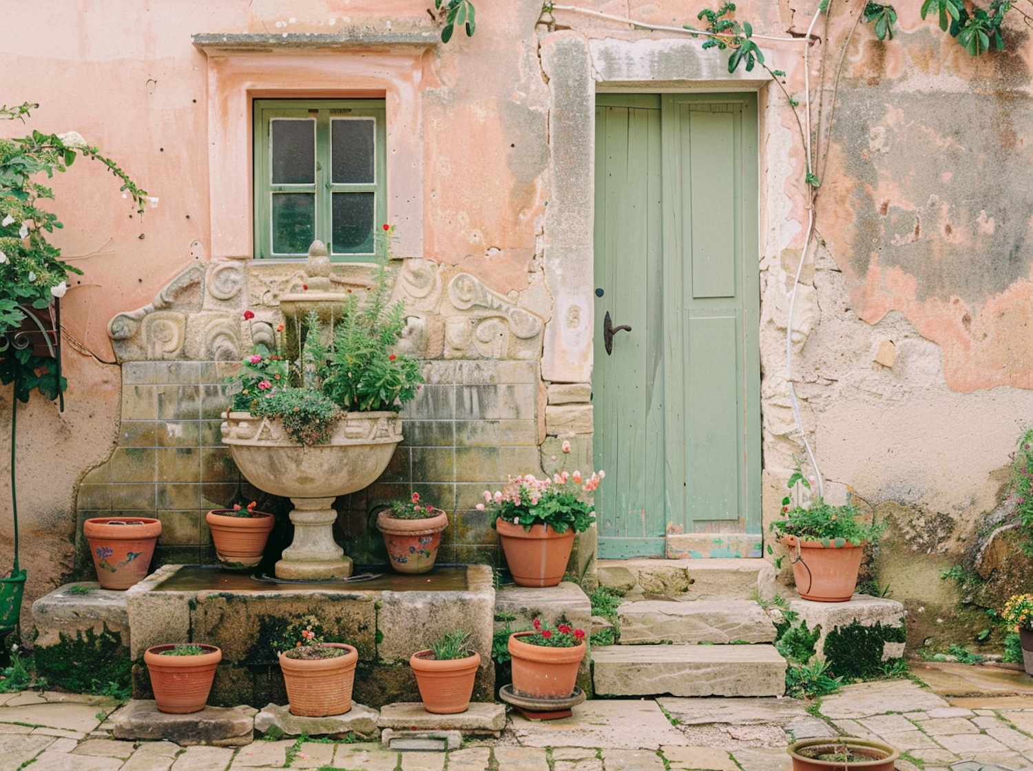Charming rustic courtyard with a green door, stone fountain, and terracotta pots against a weathered pink wall.