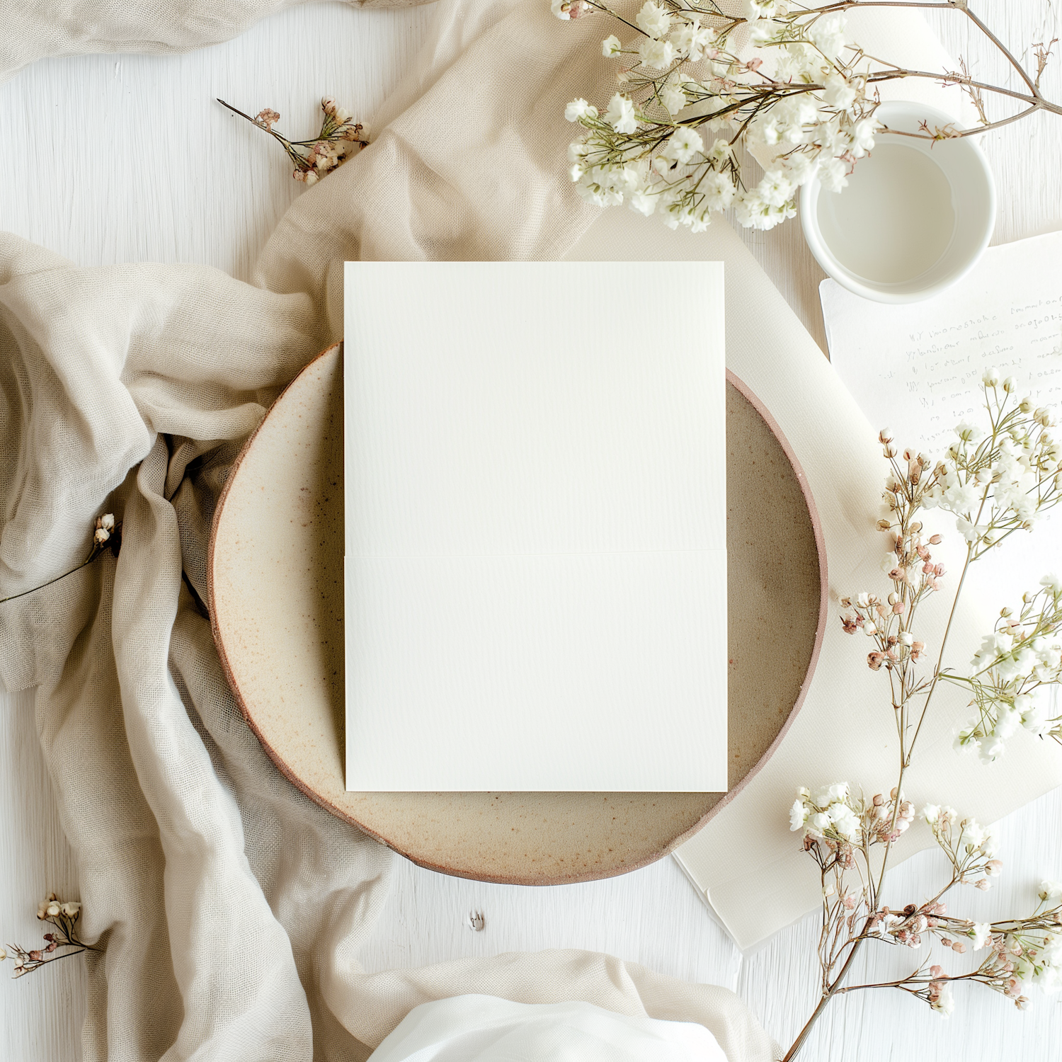 Elegant flat lay with a blank card on a ceramic plate, surrounded by baby's breath flowers and soft beige fabric.
