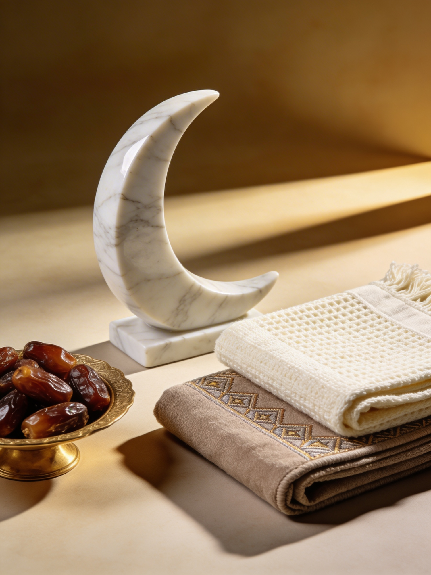 A marble crescent moon, golden bowl of dates, and folded textiles with intricate patterns in a warm, serene setting.