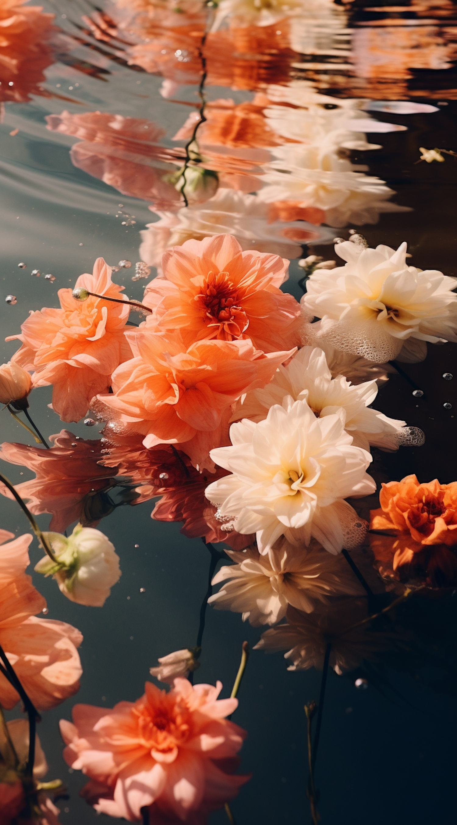 Delicate peach and white flowers float on water, creating a serene and reflective scene with gentle ripples and light play.
