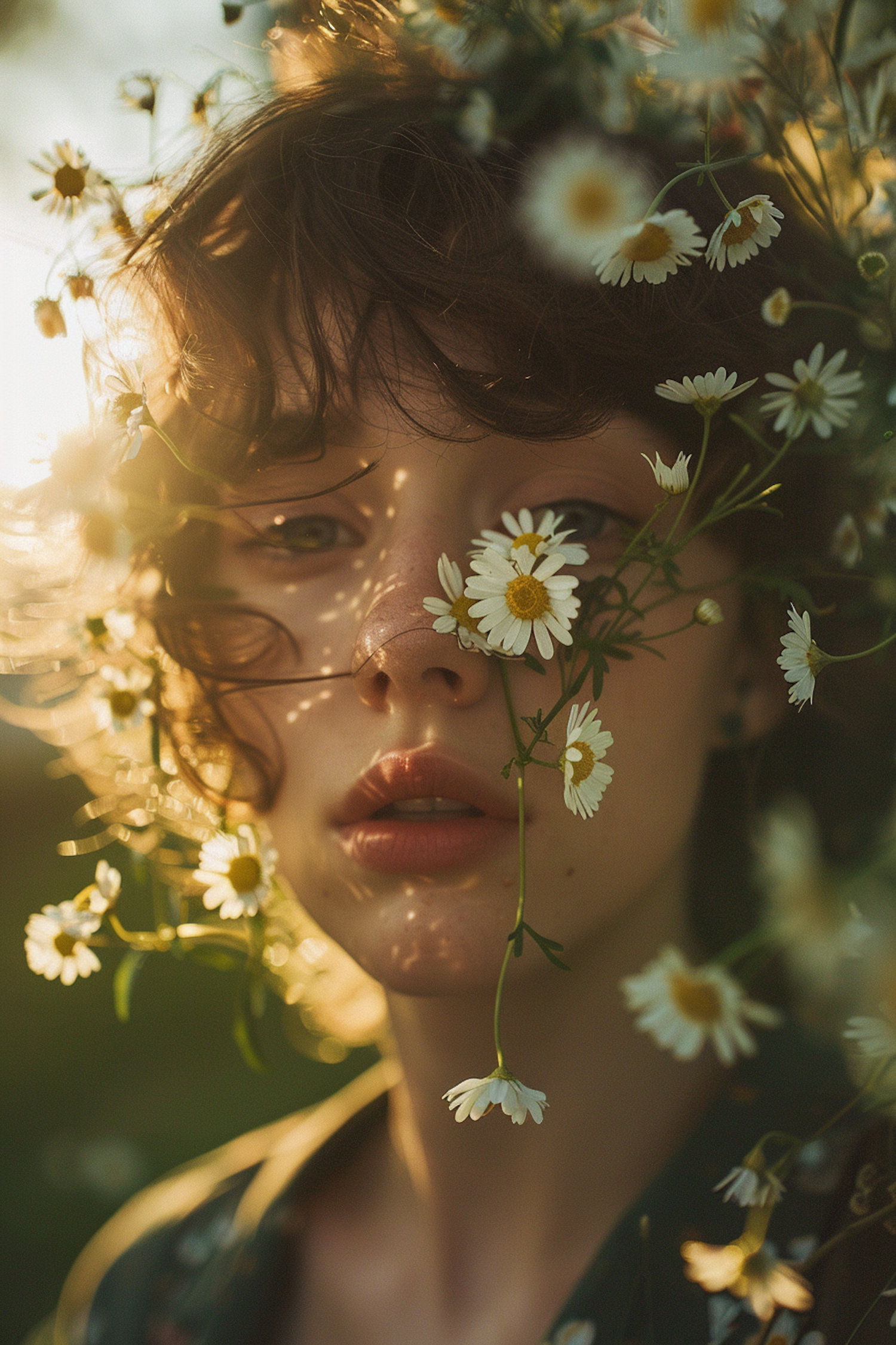 A serene portrait of a person with daisies in their hair, bathed in warm sunlight, creating a whimsical and natural atmosphere.