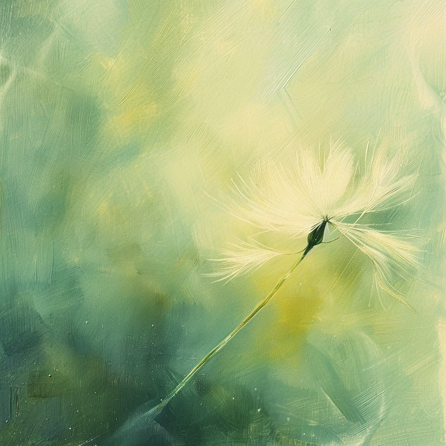 Ethereal dandelion seed head against a dreamy green and yellow background, painted with soft brush strokes.