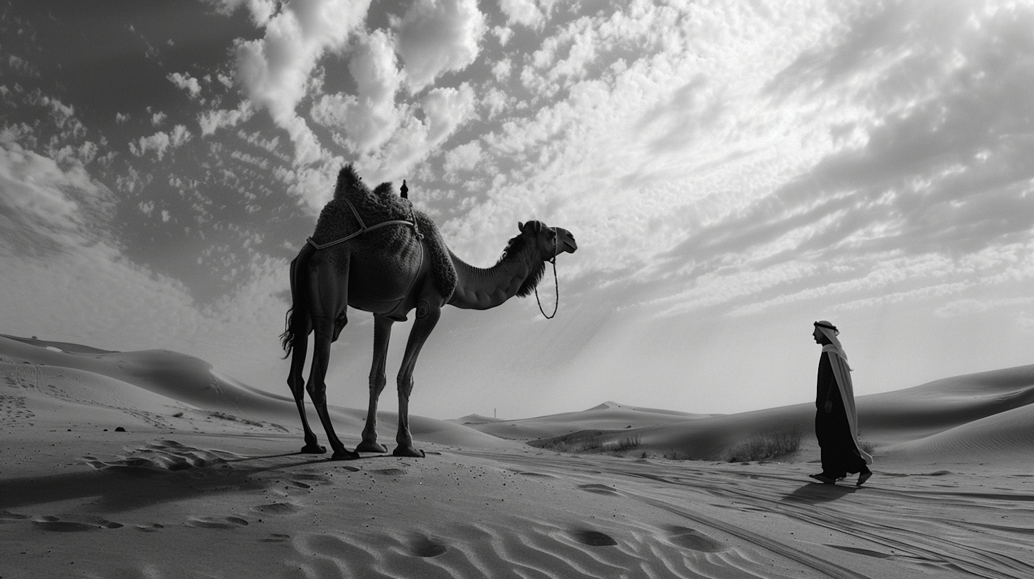 Monochrome desert scene with a camel and a man in traditional attire walking across sand dunes under a cloudy sky.