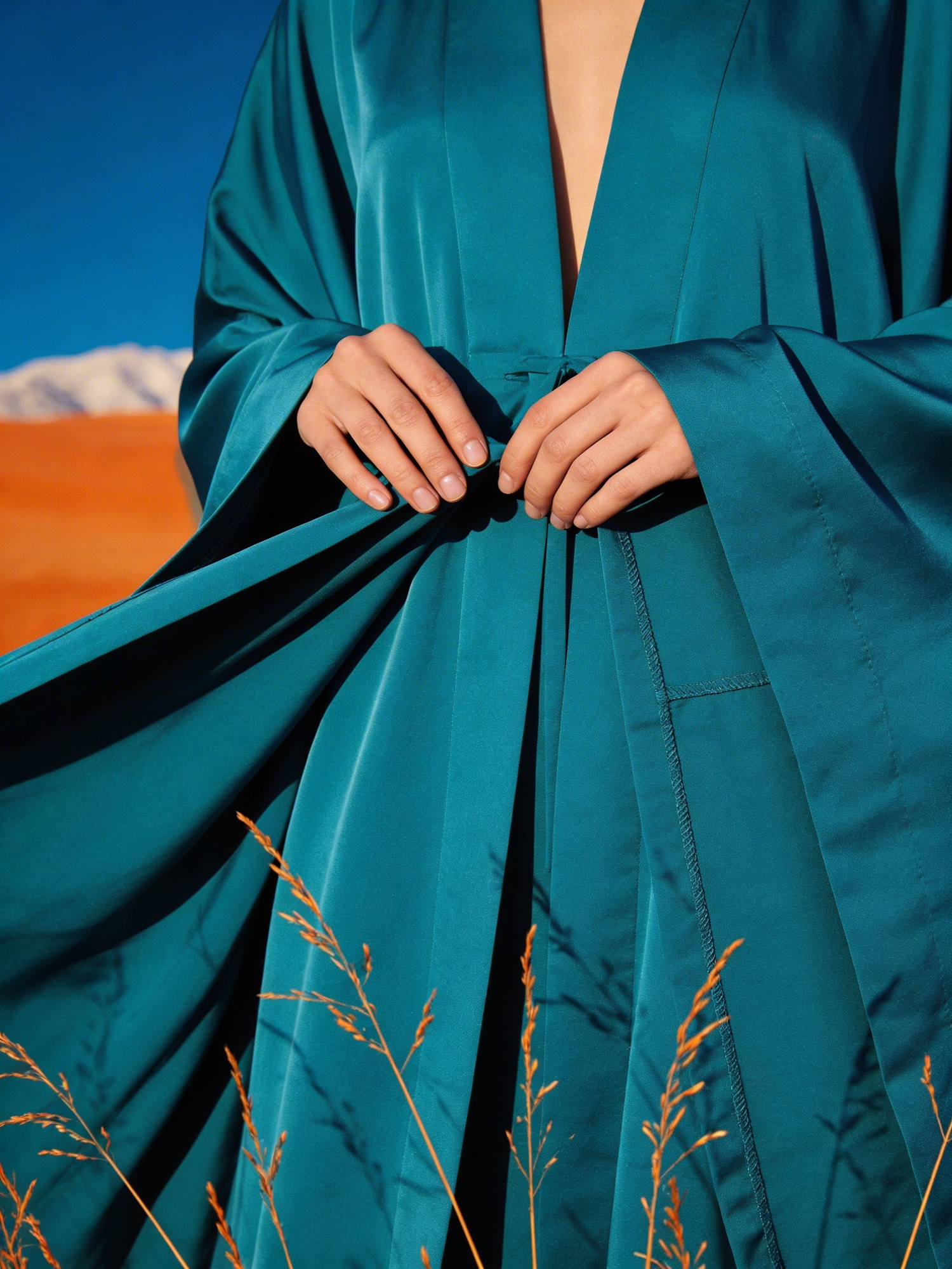 A close-up of a person in a teal garment against a vibrant desert backdrop, highlighting the fabric's texture and the vivid color contrast.