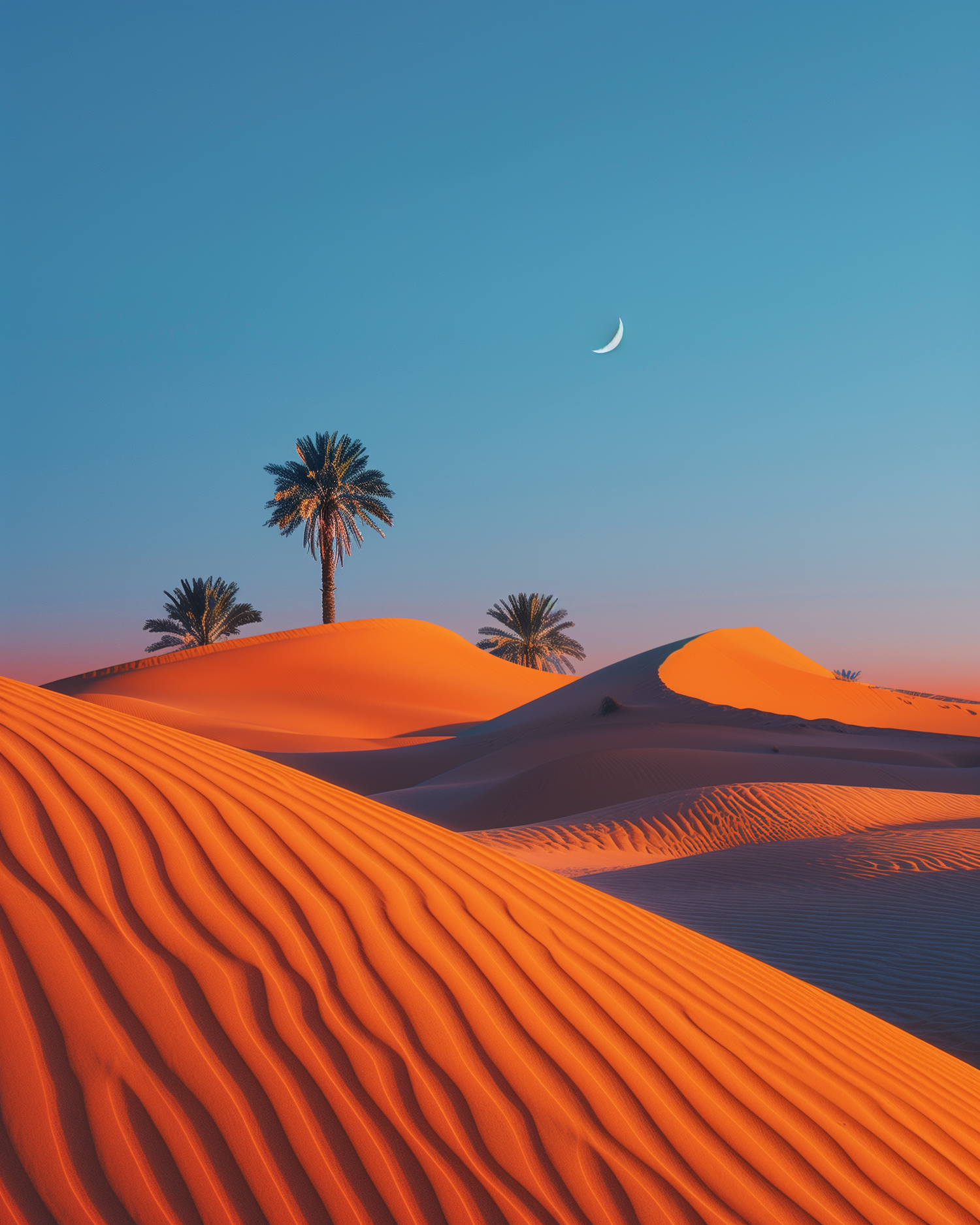 Stunning desert scene with golden sand dunes, palm trees, and a crescent moon against a clear blue sky at sunset.