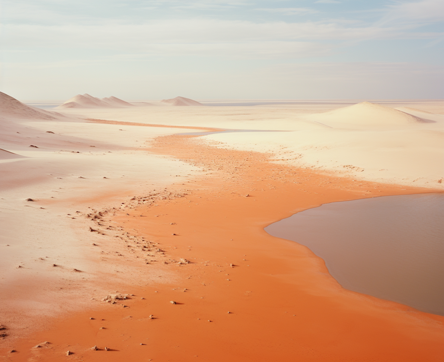 Serene desert landscape with rolling dunes and a small oasis under a pale blue sky, showcasing contrasting beige and orange sands.