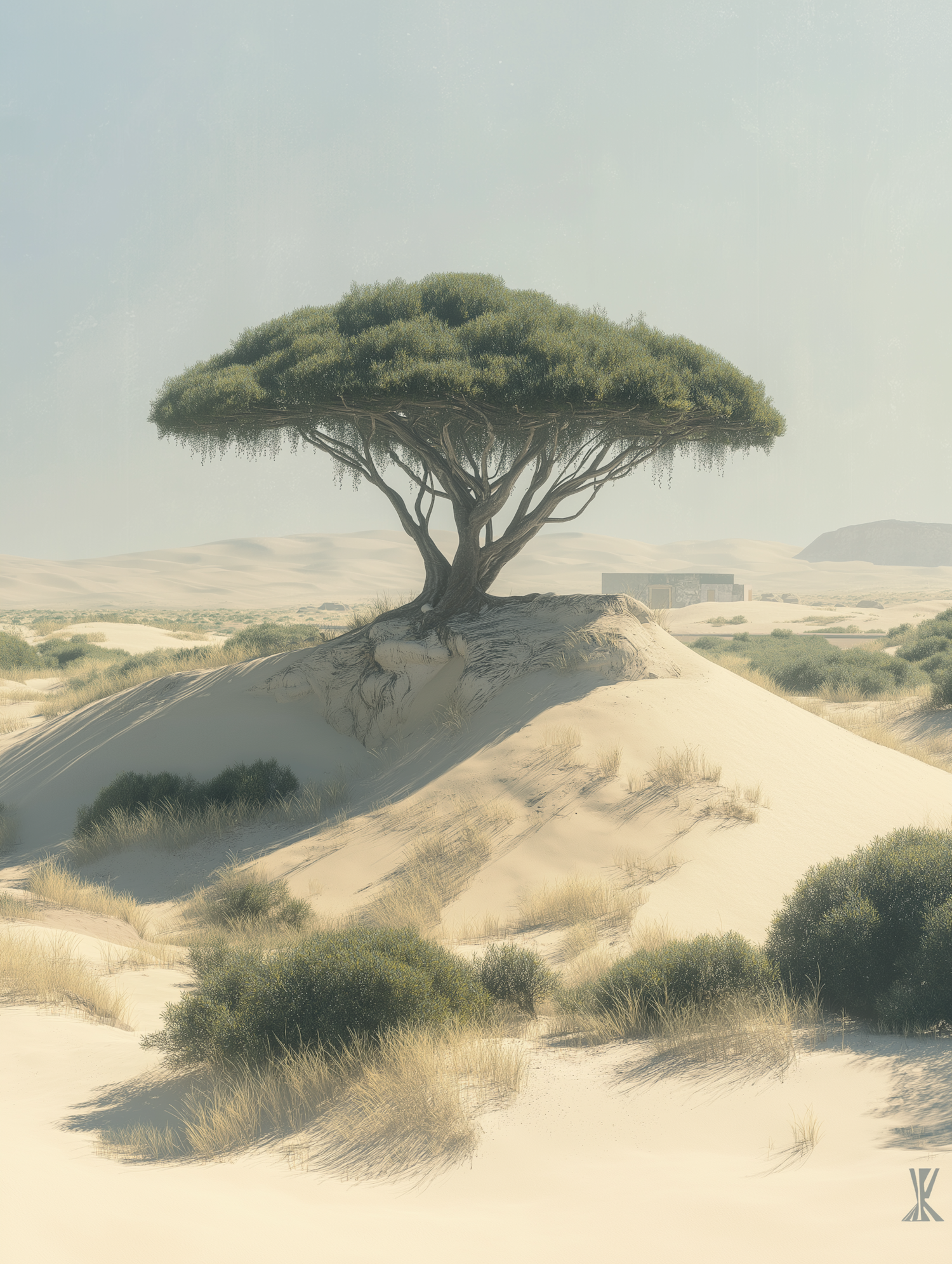A lone tree with a lush canopy atop a sandy dune in a serene desert landscape, surrounded by shrubs and distant rolling dunes.