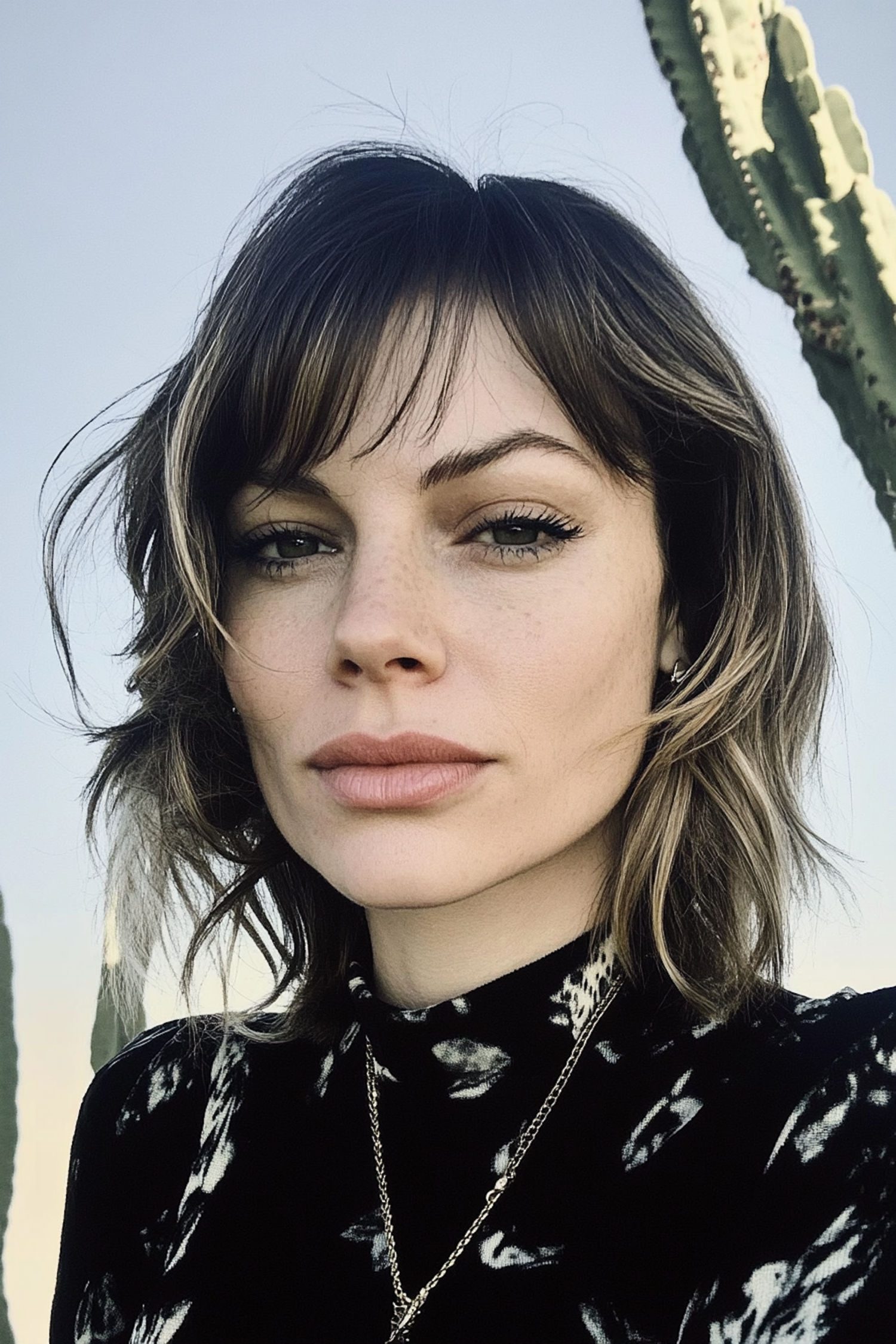 Caucasian woman with light brown hair and blue eyes, wearing a patterned top, stands against a clear sky with cacti in the background.