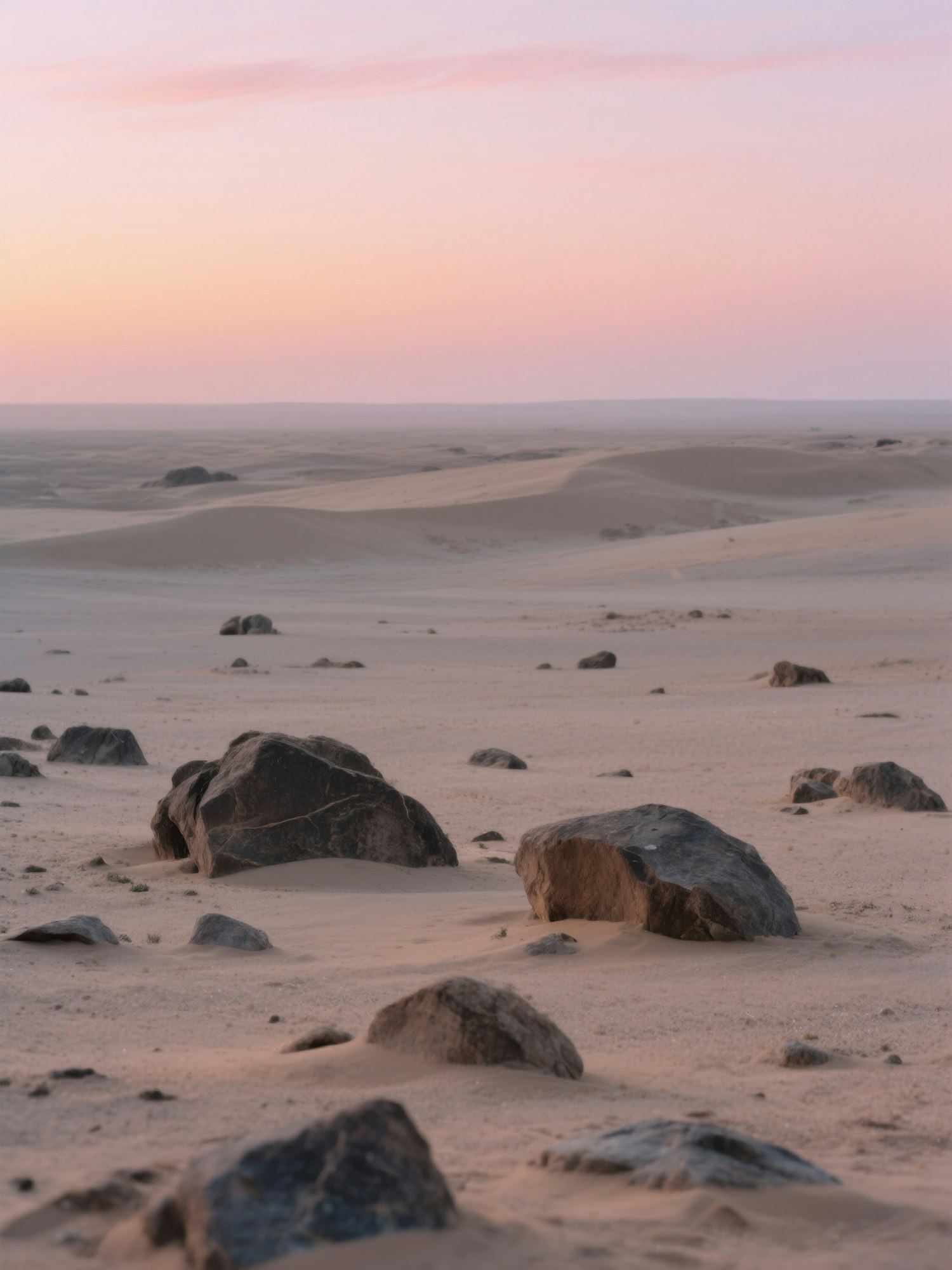 a minimalist and cinematic landscape, natural lighting, realistic details, soft contrast, slightly desaturated tones, large depth of field, peaceful atmosphere, no people, high resolution, editorial style, minimalist rocky desert at dusk, subtle pink and amber sky, vast flat ground