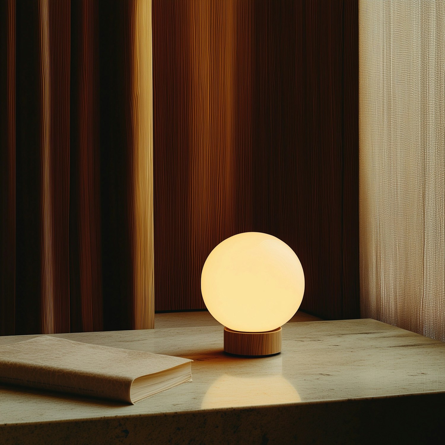 A cozy scene with a glowing spherical lamp on a stone surface, next to a closed book, against dark brown curtains.