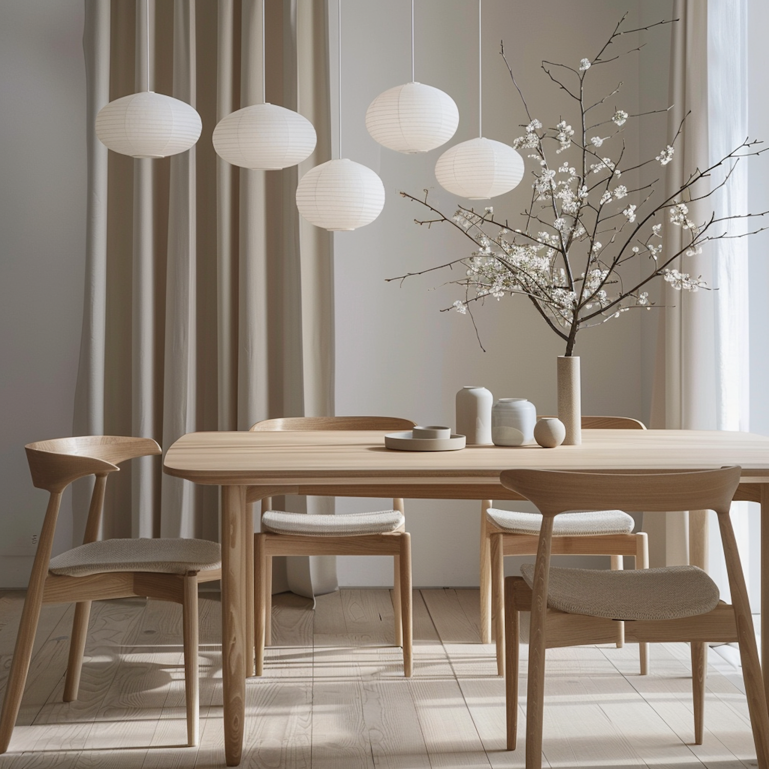 Minimalist dining room with wooden furniture, paper lanterns, and a vase of blossoms, creating a serene and natural ambiance.
