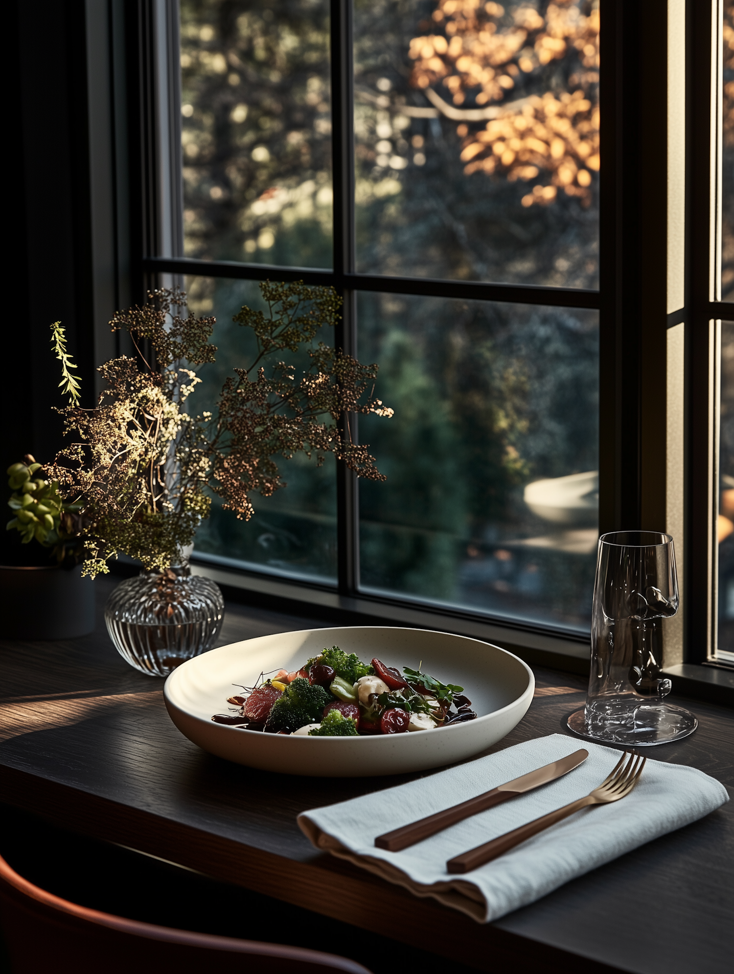 Elegant dining setup with a fresh salad, gold cutlery, and dried flowers by a sunlit window overlooking a serene garden.