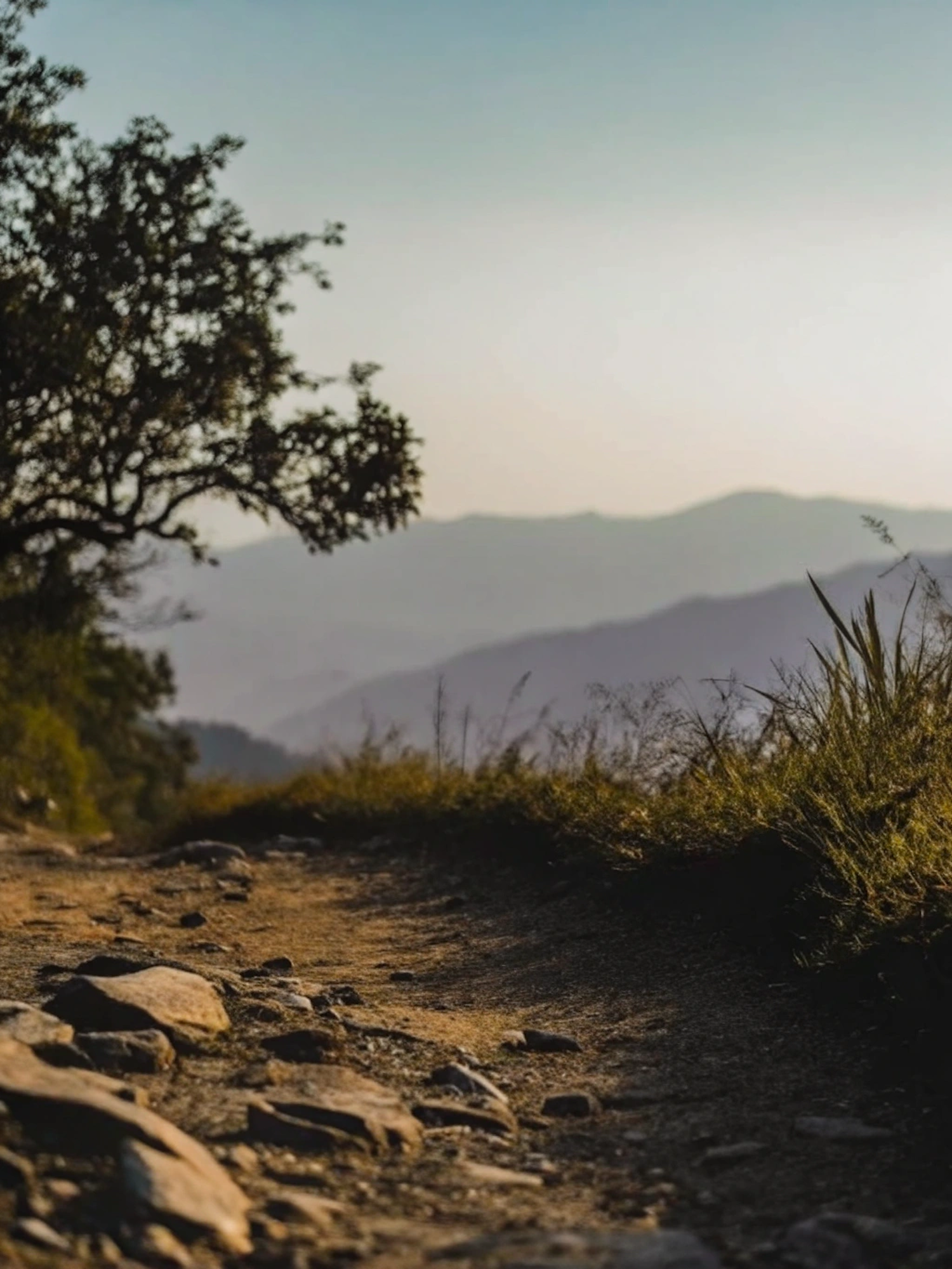 A peaceful dirt path with rocks and grass, leading to hazy mountains under a golden sky. Perfect for nature lovers and hikers.