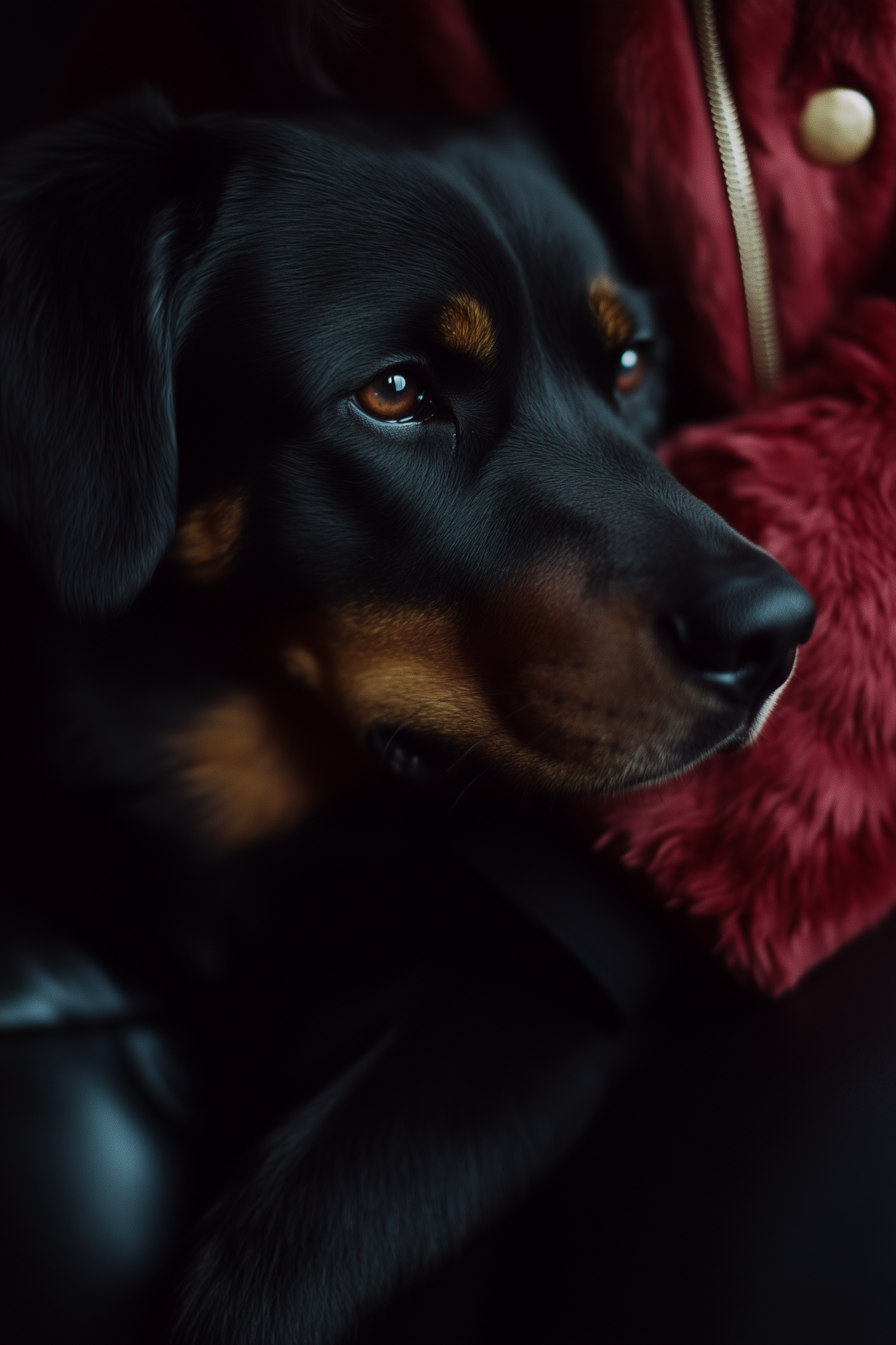 Close-up of a black and tan dog resting on red fur, with expressive brown eyes and sleek fur.