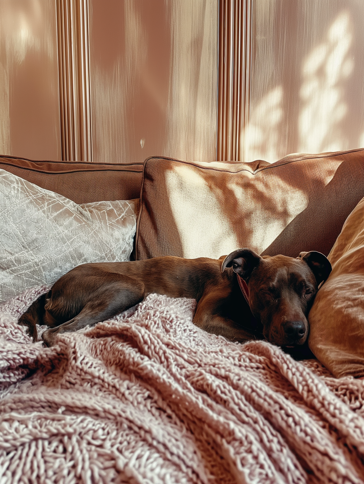 A brown dog sleeps peacefully on a cozy couch with soft blankets and pillows, bathed in warm sunlight.