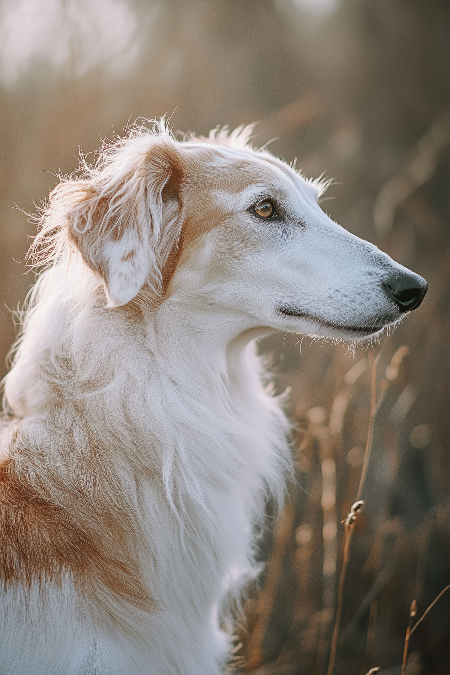 Elegant dog with flowing white and brown fur in a serene natural setting, captured in soft sunlight.