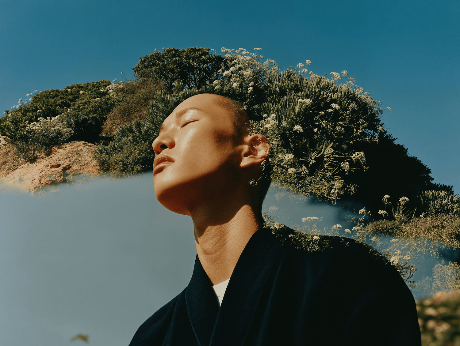 A serene double exposure of a person and nature, blending human and natural elements under a clear blue sky.