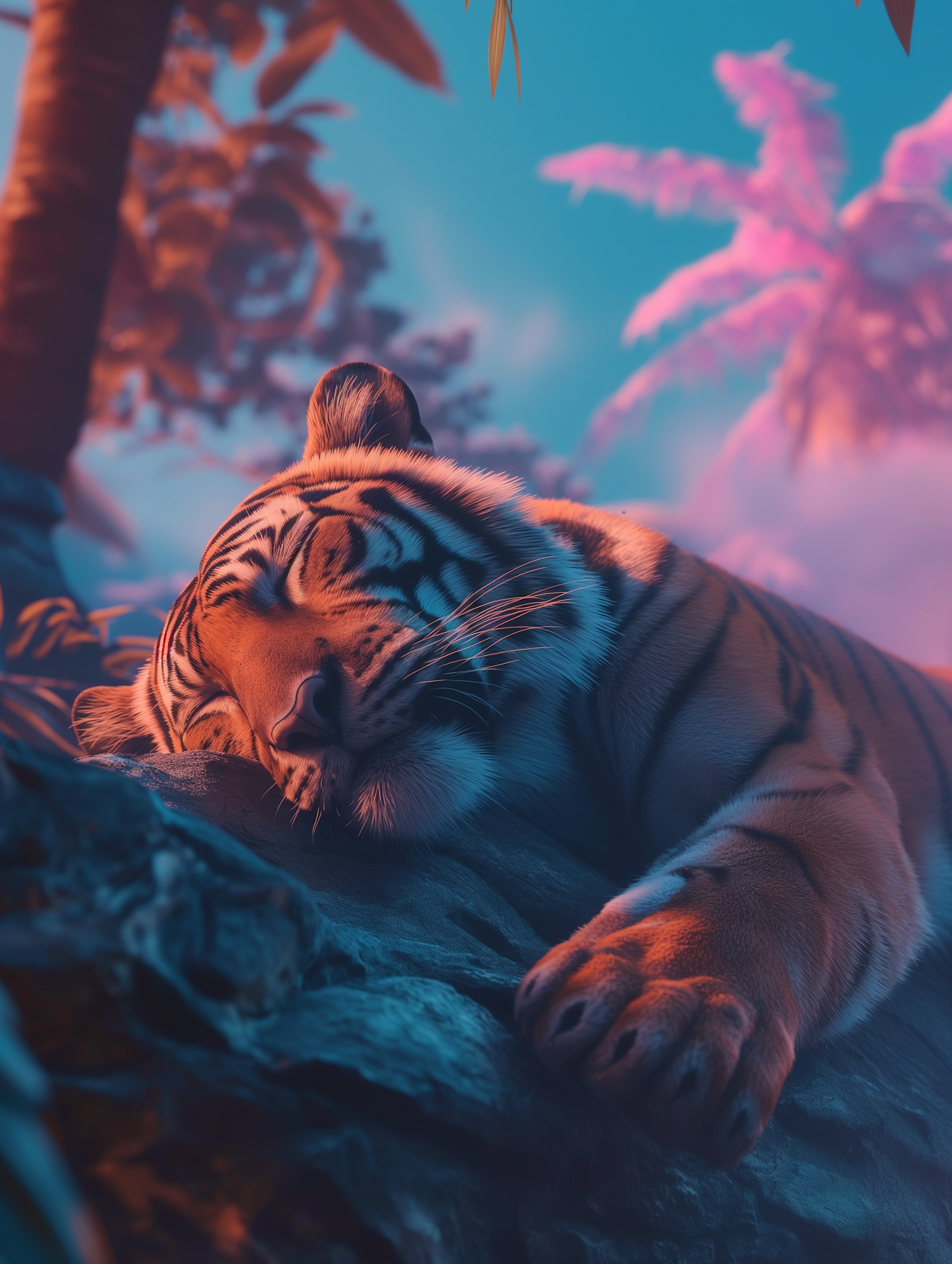 A tranquil tiger rests on a rock in a surreal tropical setting with pink trees and a turquoise sky, bathed in warm, soft light.