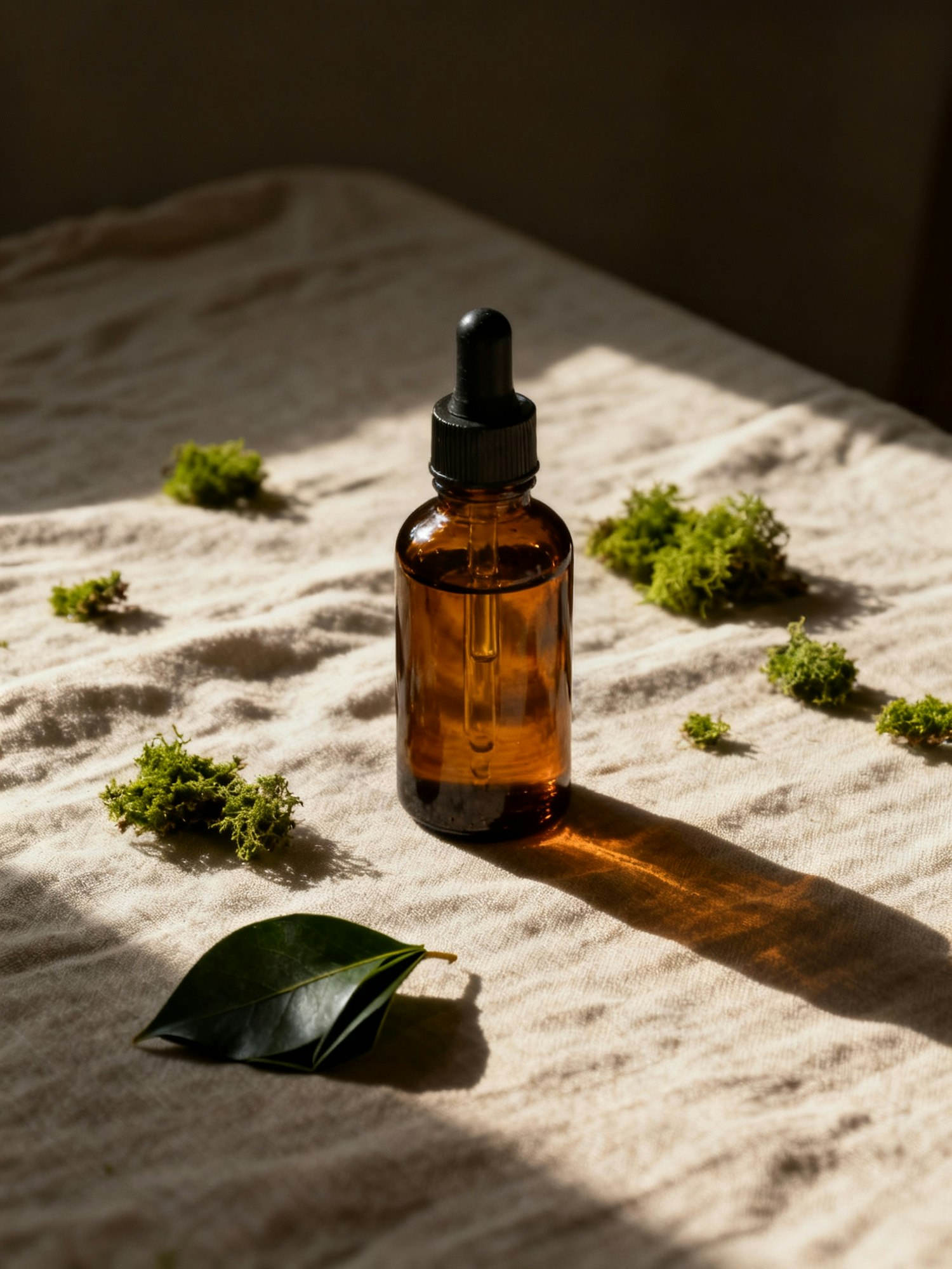 A brown glass dropper bottle on beige fabric, surrounded by green moss and leaves, illuminated by soft natural light.