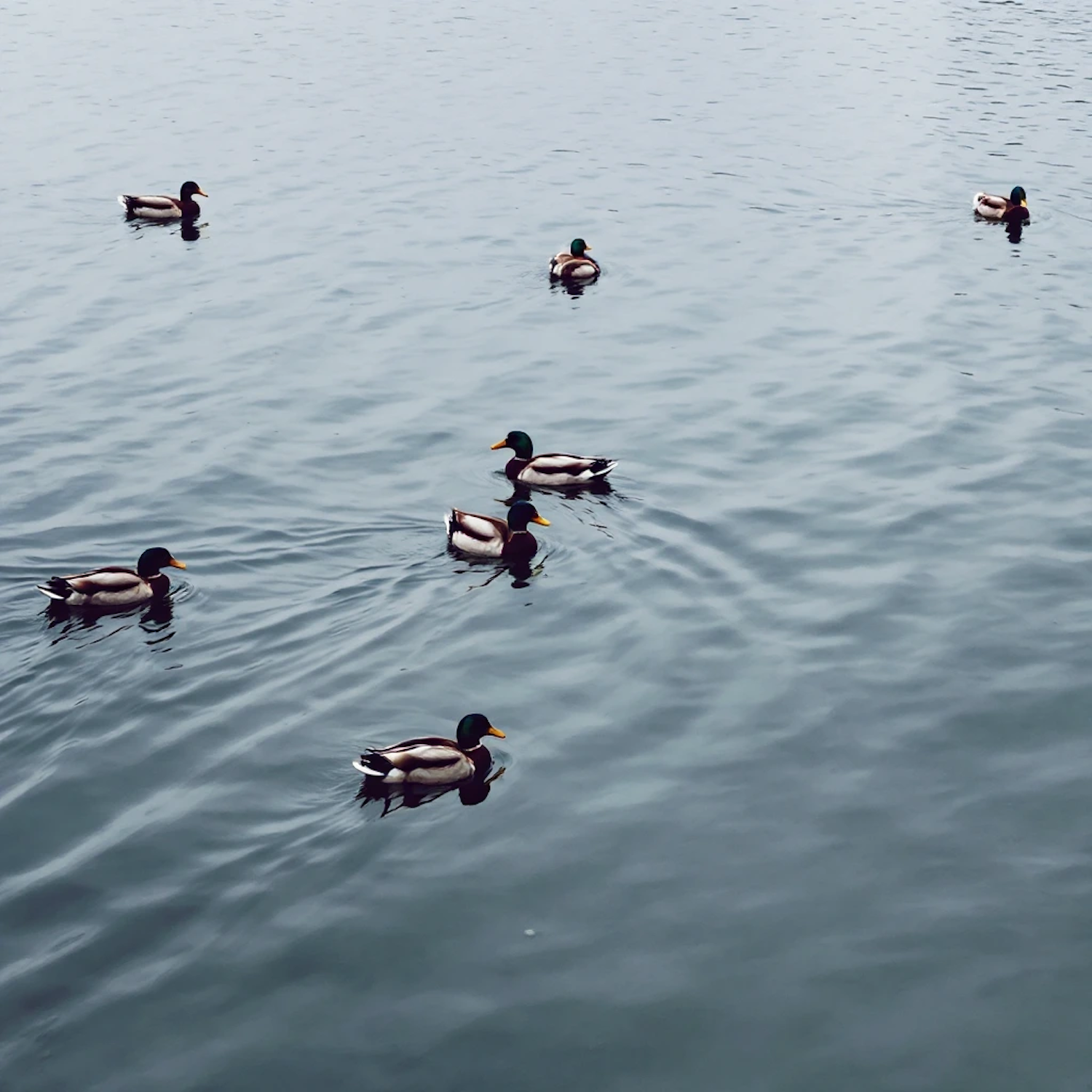 Six mallard ducks with green heads and brown bodies float on calm, rippling water under overcast skies, creating a serene scene.