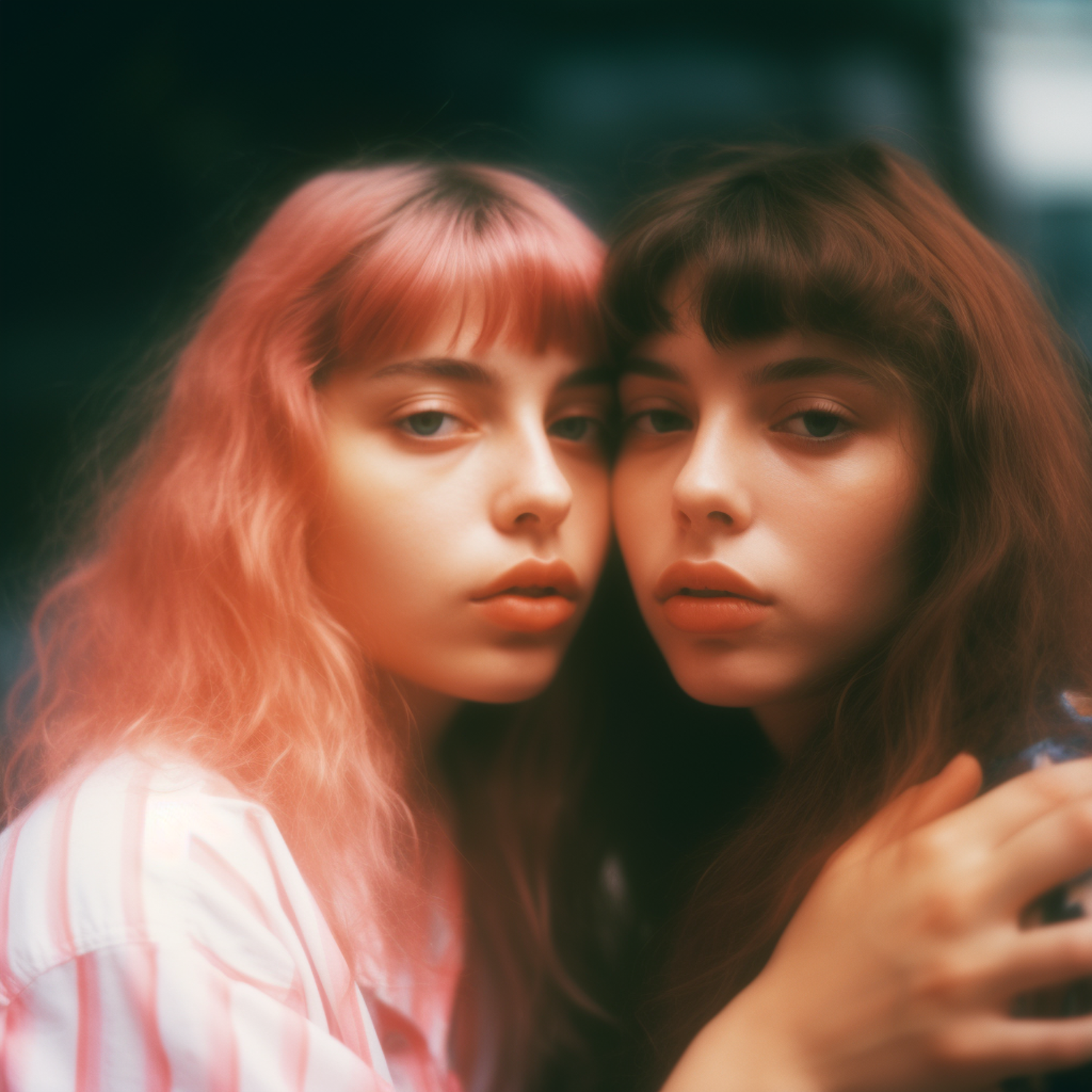 Two young women with pink and brown hair pose closely, their serene expressions highlighted by soft, warm lighting.