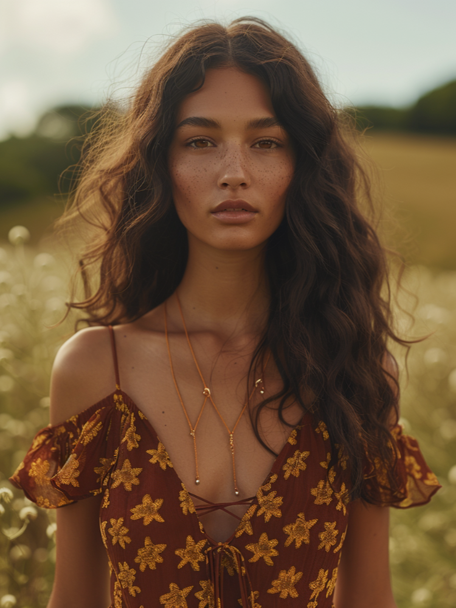 Young woman with wavy dark hair in a floral dress, standing in a sunlit field, exuding a serene and natural beauty.