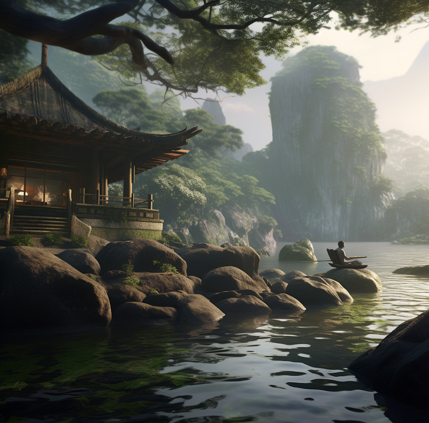 Tranquil scene with a pagoda by a calm lake, lush greenery, and a meditating figure on rocks. Misty cliffs in the background.