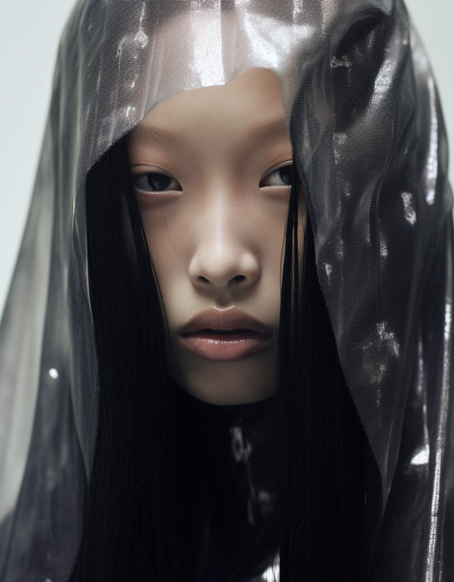 A mysterious portrait of an Asian woman with metallic fabric draped over her head, highlighting her serene expression and ethereal beauty.