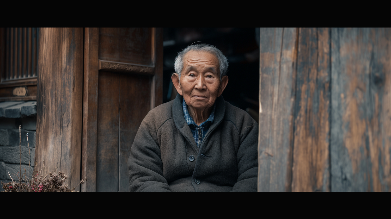 Elderly Asian man in a rustic wooden doorway, wearing a gray jacket and blue plaid shirt, with a calm expression.