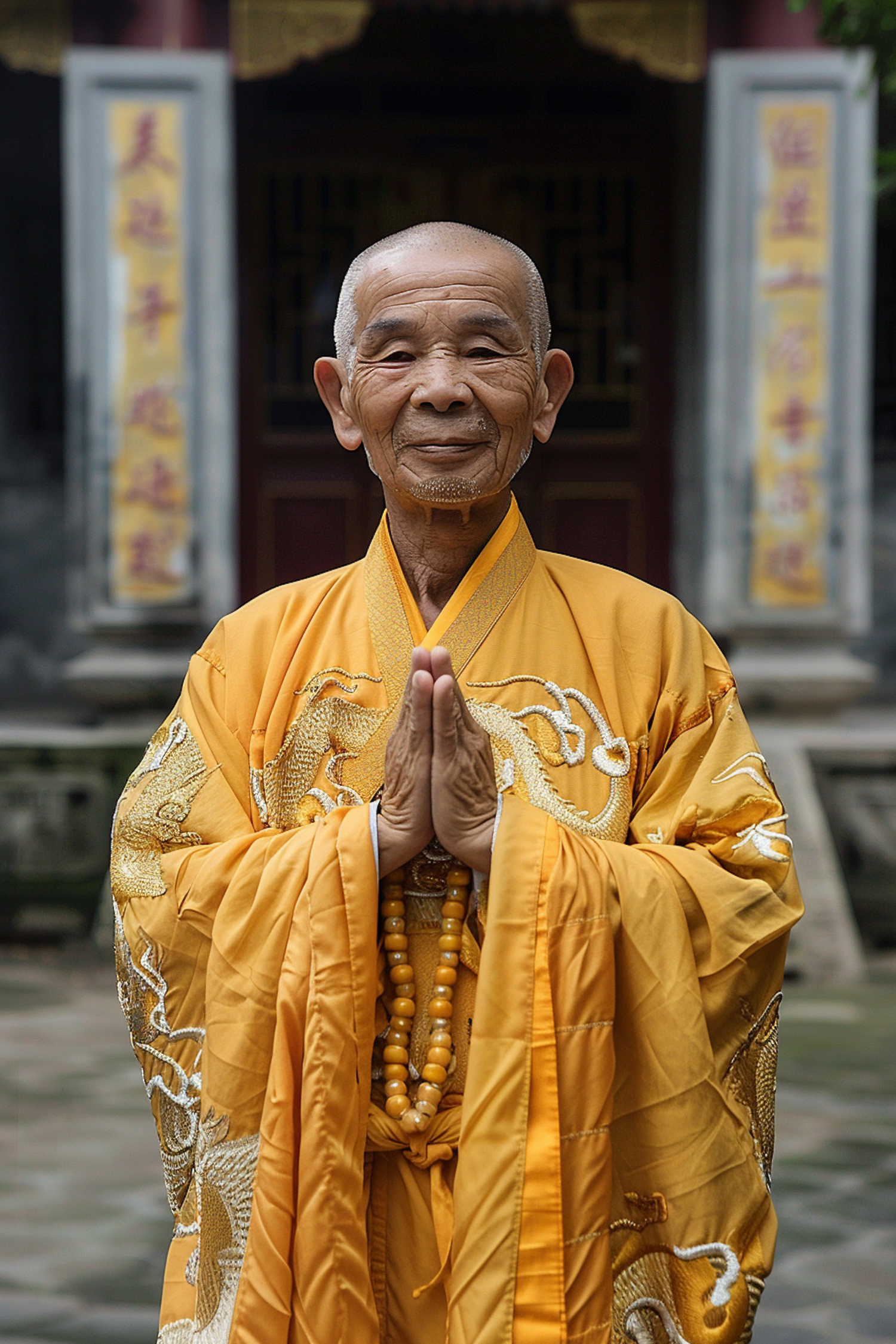 Elderly Asian man in ornate yellow robe, hands in prayer, standing before a temple with Asian script banners.