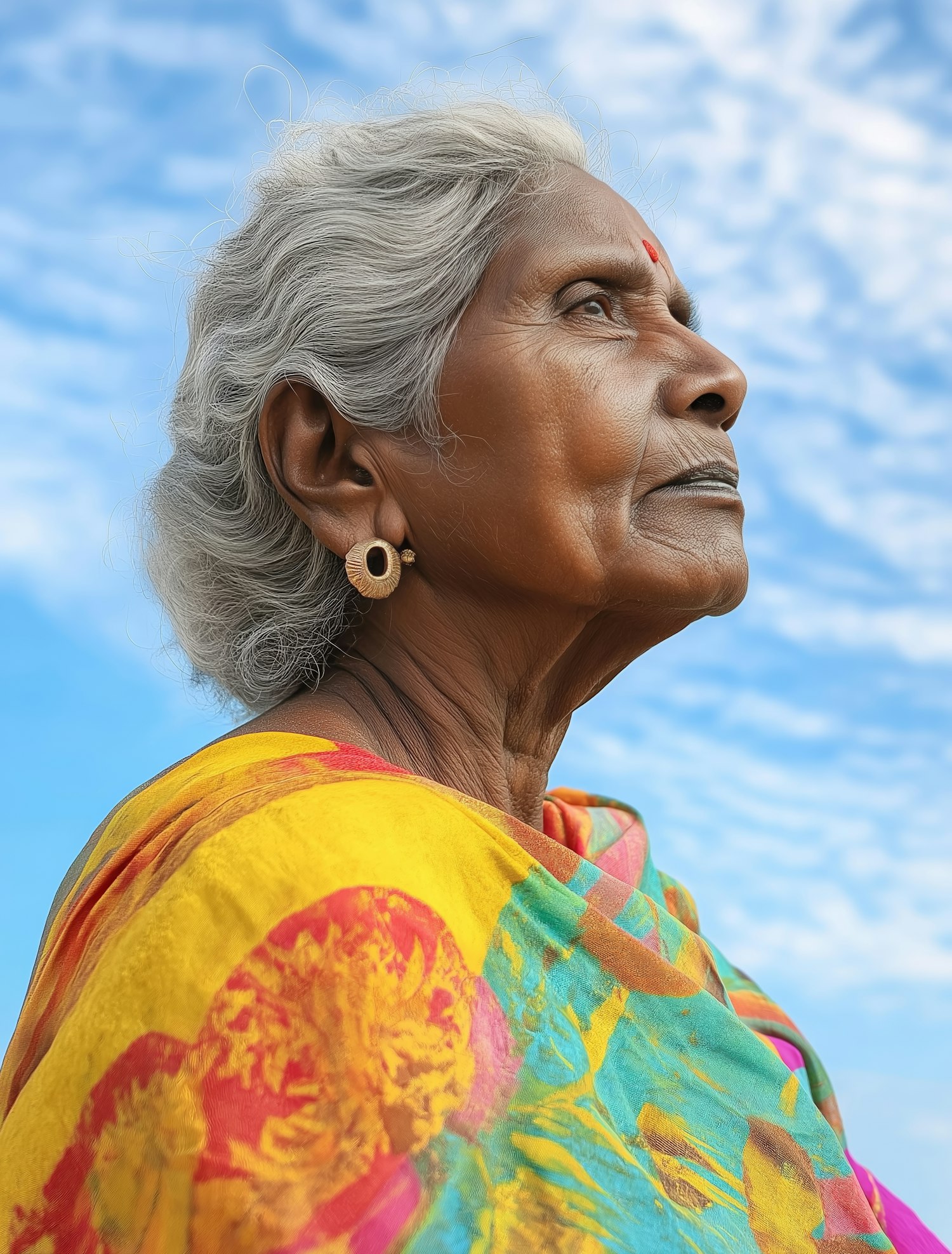 Elderly woman in a vibrant sari gazing upward against a blue sky, exuding grace and wisdom in a serene outdoor setting.