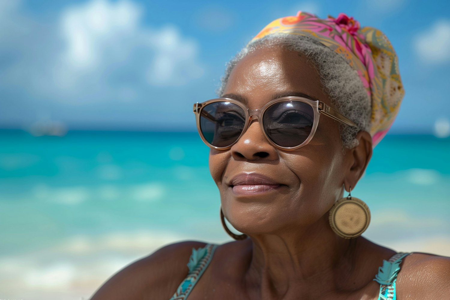 Elderly woman with sunglasses and headscarf enjoys a sunny beach day, with turquoise ocean and blue sky in the background.