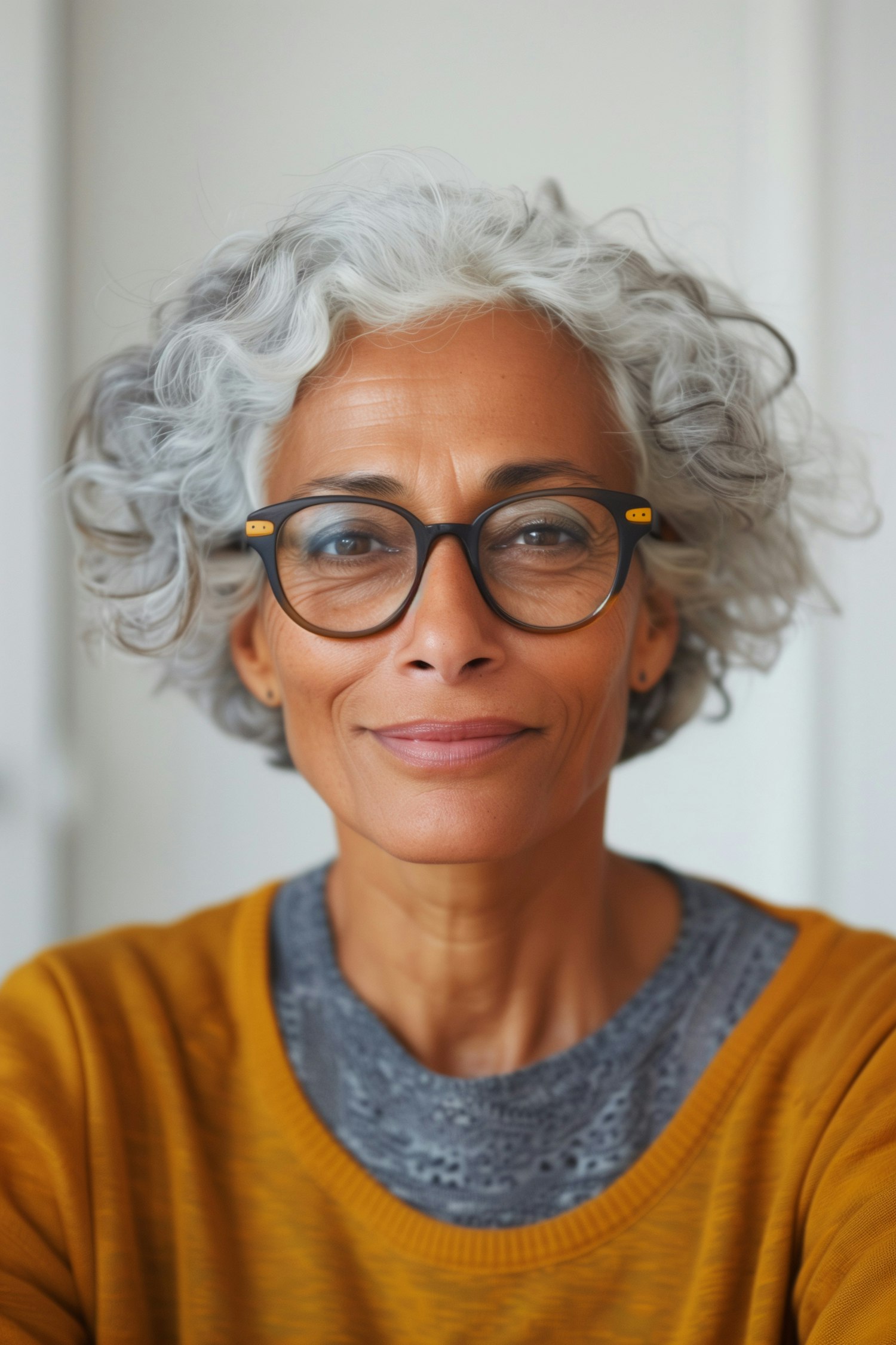 Confident middle-aged woman with curly gray hair and glasses, wearing a mustard sweater. Warm smile and deep brown eyes.