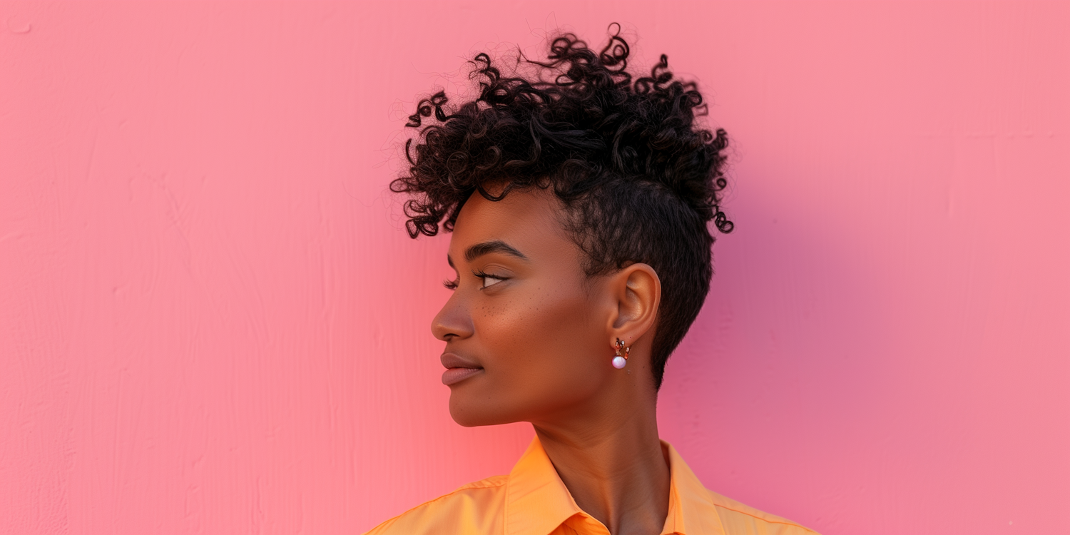 Stylish woman with curly mohawk against a pink background, wearing an orange shirt. Bold colors and elegant profile.