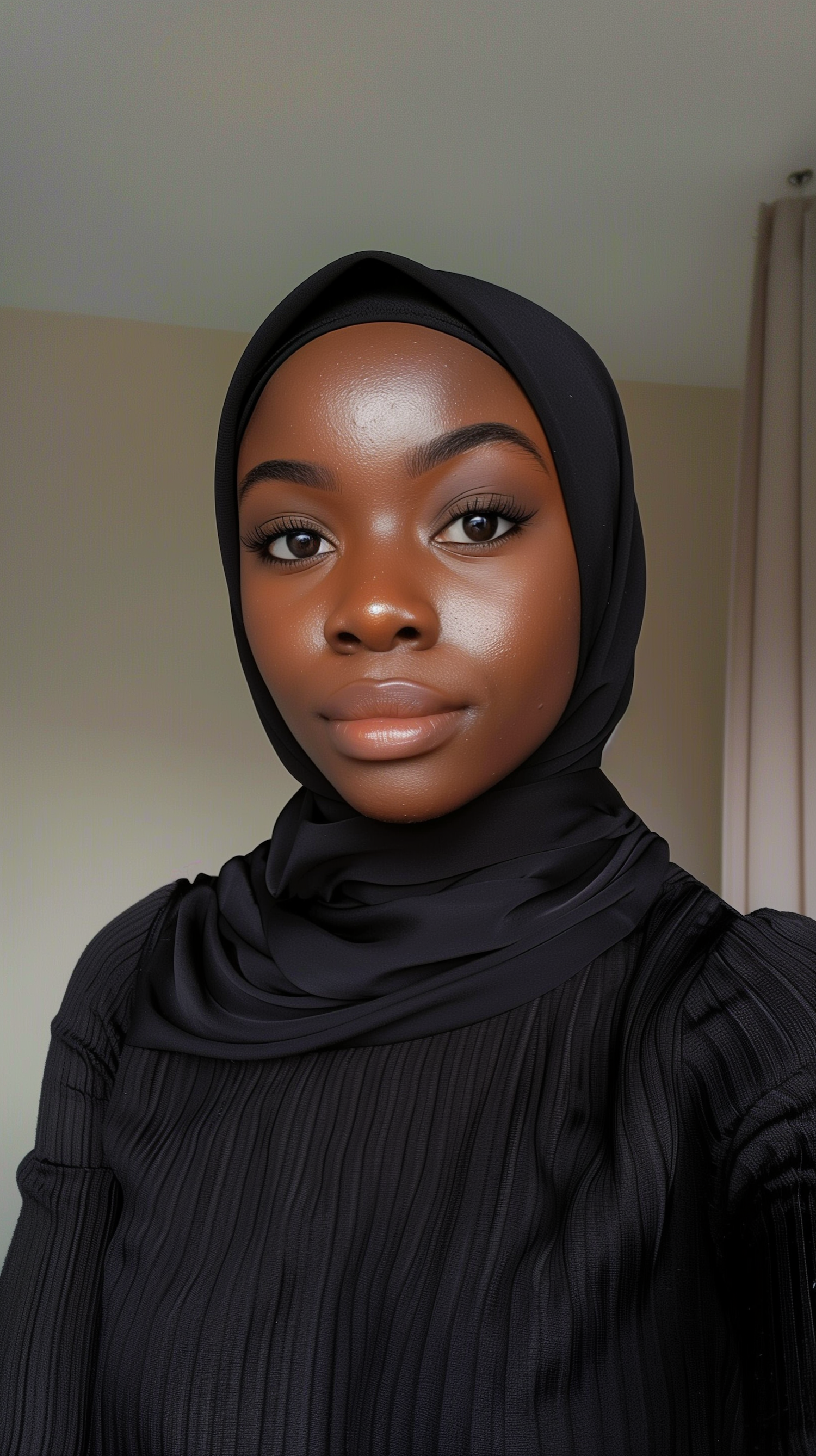 Portrait of a young Black woman in a black hijab, showcasing elegance and confidence with a serene expression.