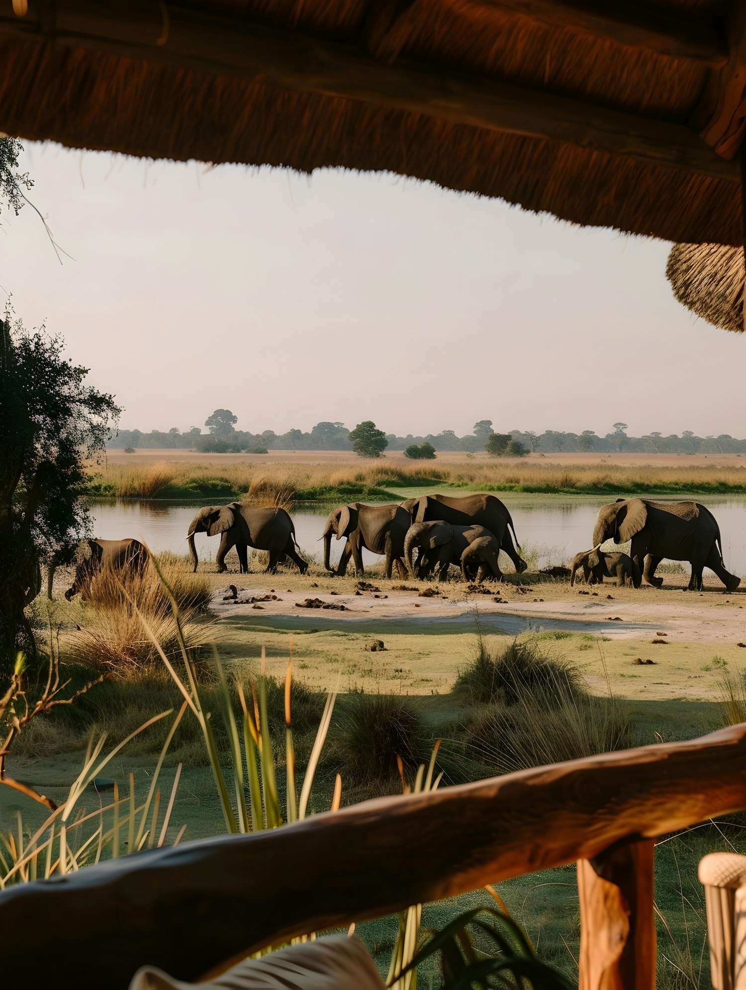 A herd of elephants strolls by a river in a lush savannah, viewed from a rustic safari lodge. Tranquil wildlife scene.