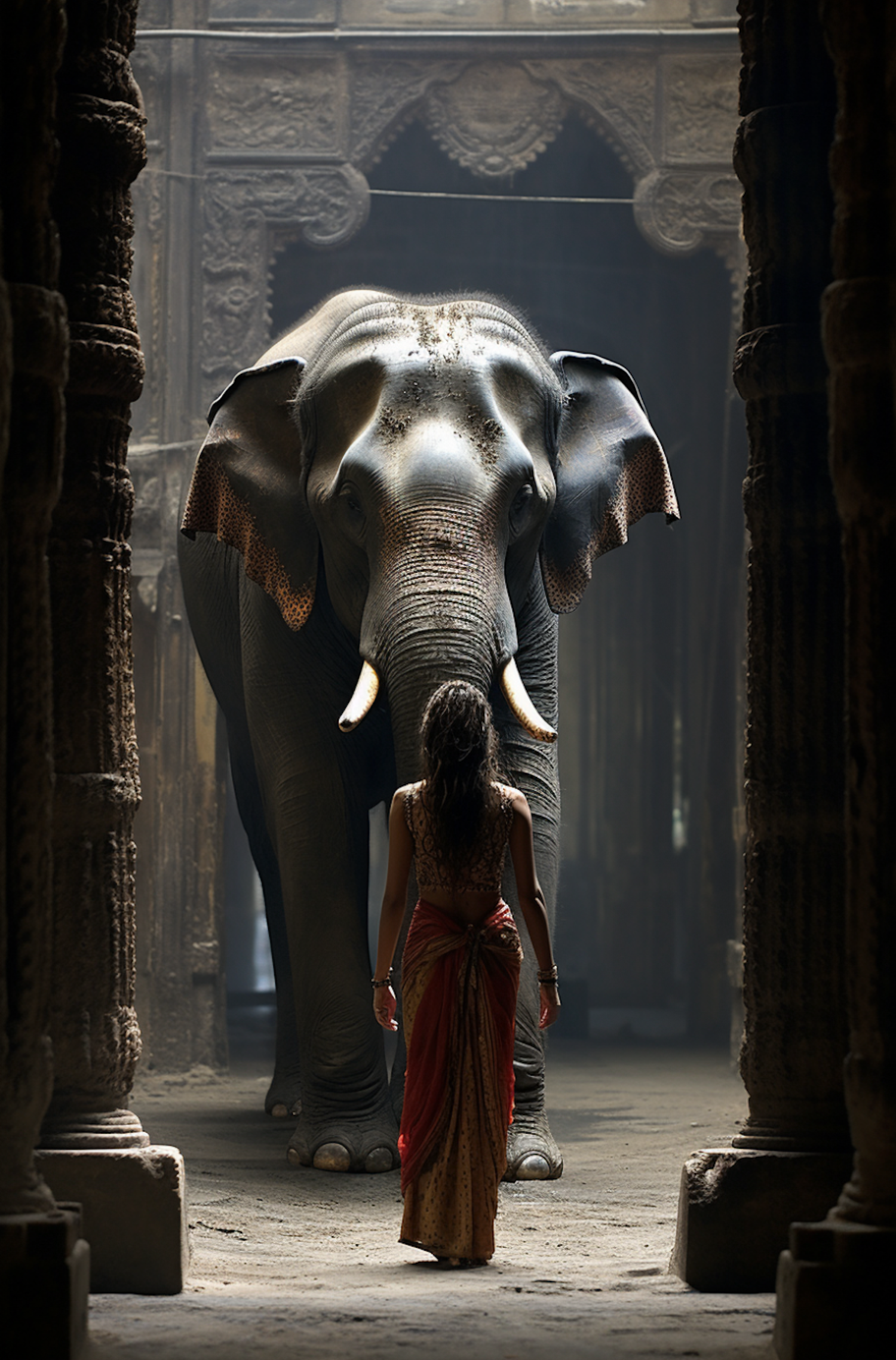 A woman in a red sari stands before a majestic elephant in an ancient temple, creating a serene and mystical scene.