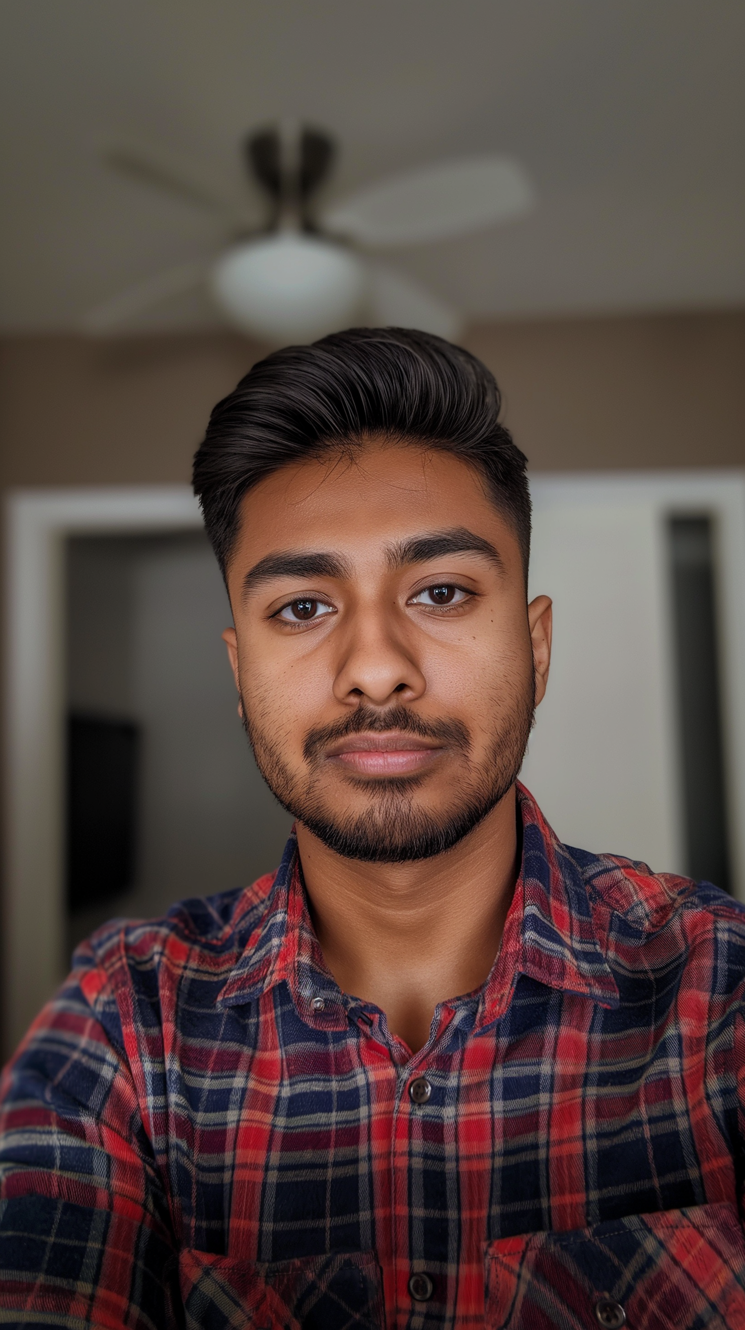 Young South Asian man with styled hair and beard in a plaid shirt, looking directly at the camera in a softly lit room.