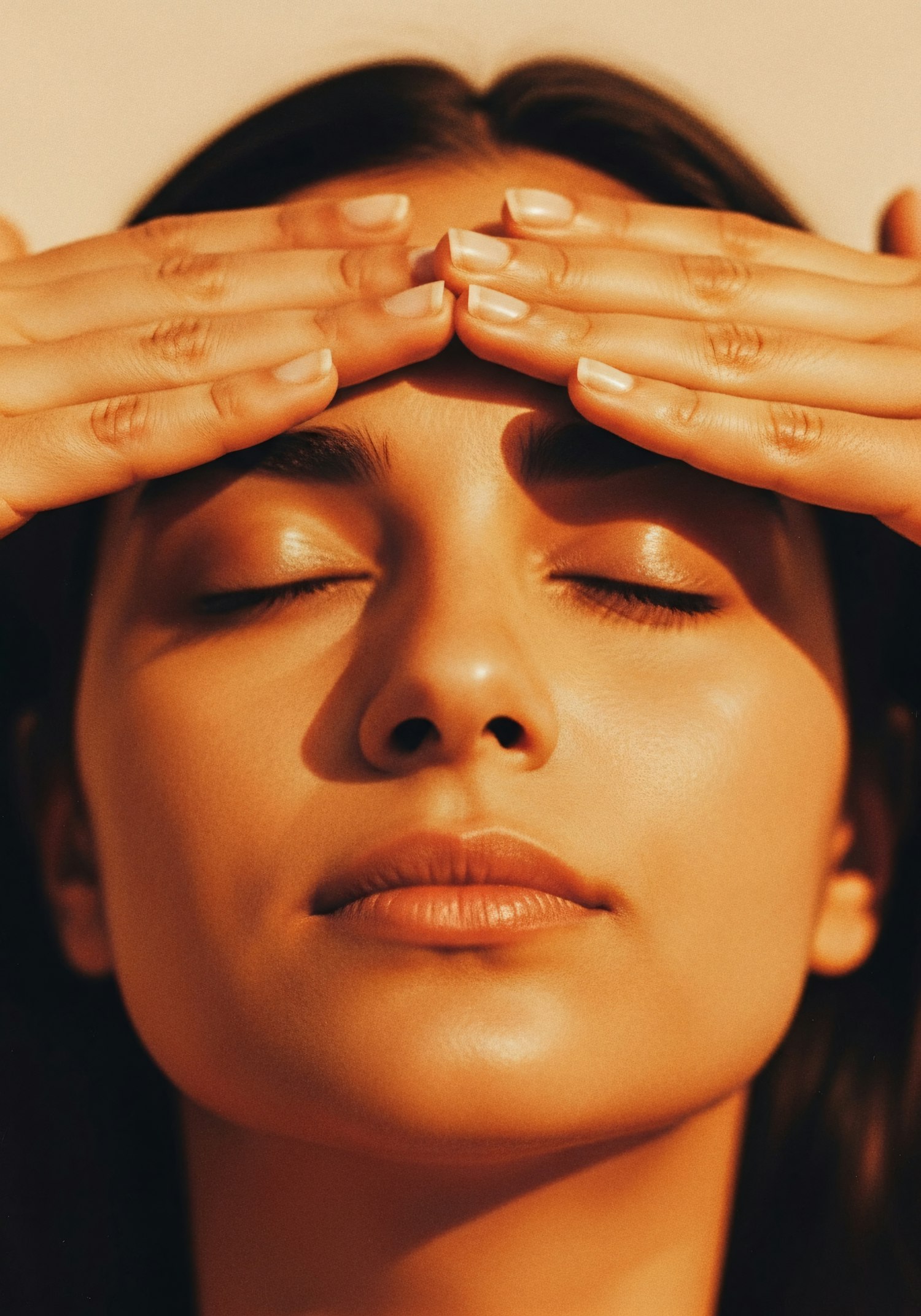 Close-up of a serene face with hands on the forehead, warm lighting highlighting smooth skin and natural tones.