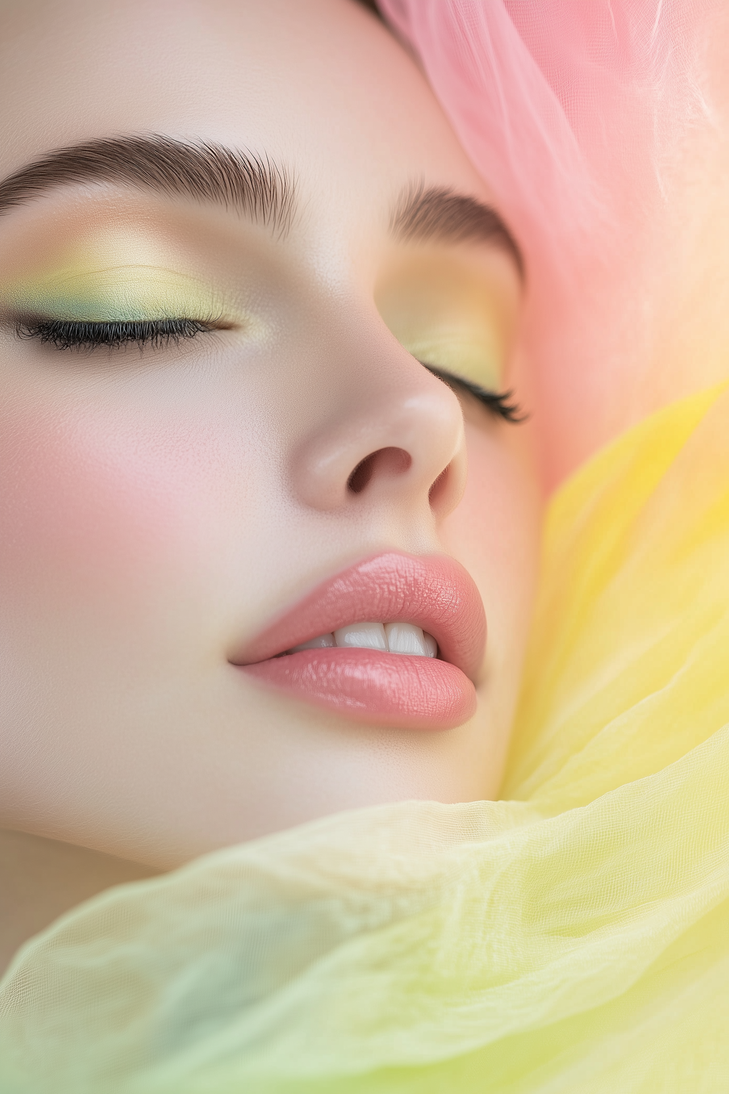 Close-up of a serene woman with pastel makeup, featuring soft pink lips and yellow eyeshadow, against a dreamy pastel background.