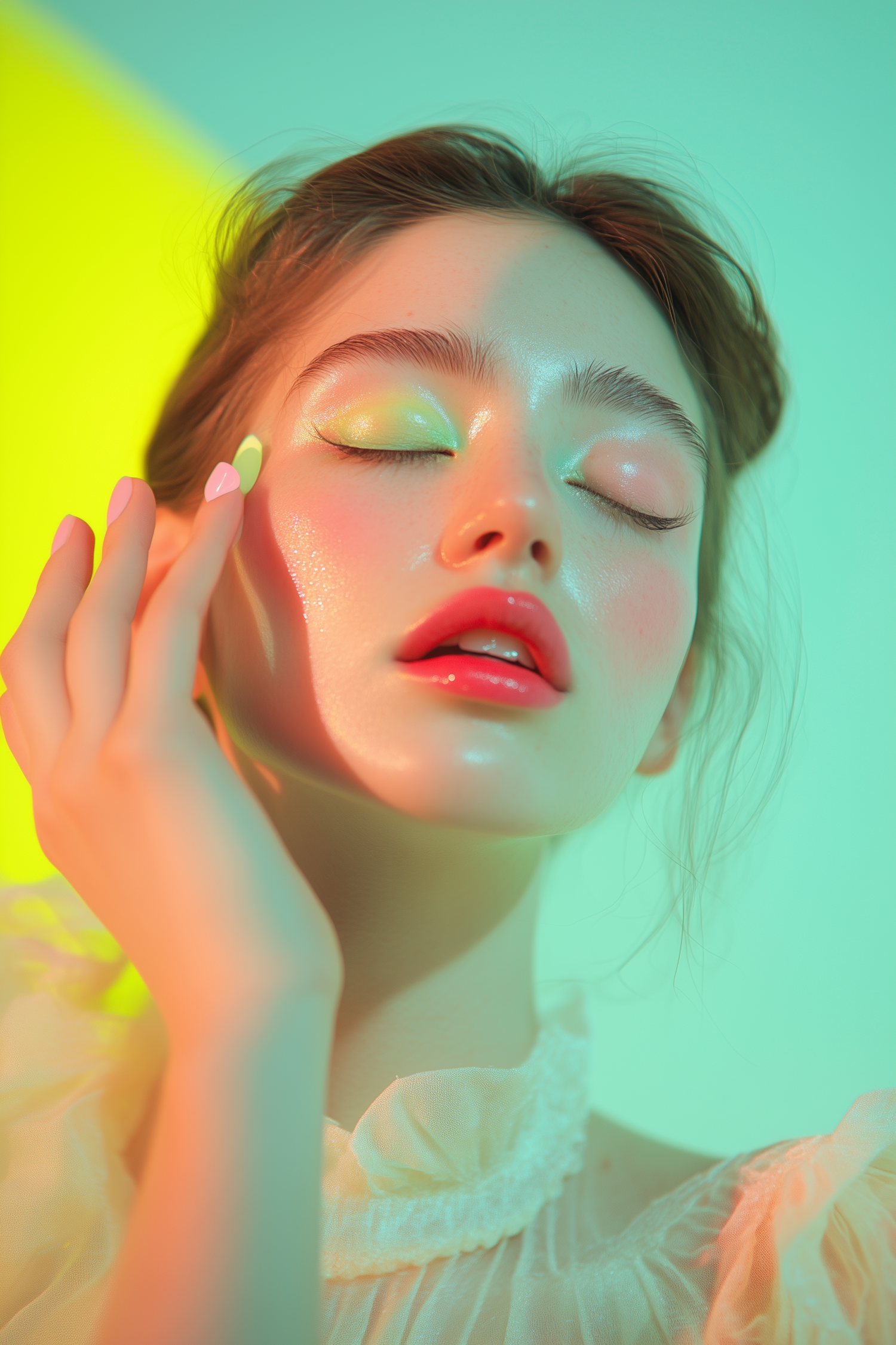 Close-up of a serene woman with pastel makeup and nails, set against a soft green and yellow gradient background.