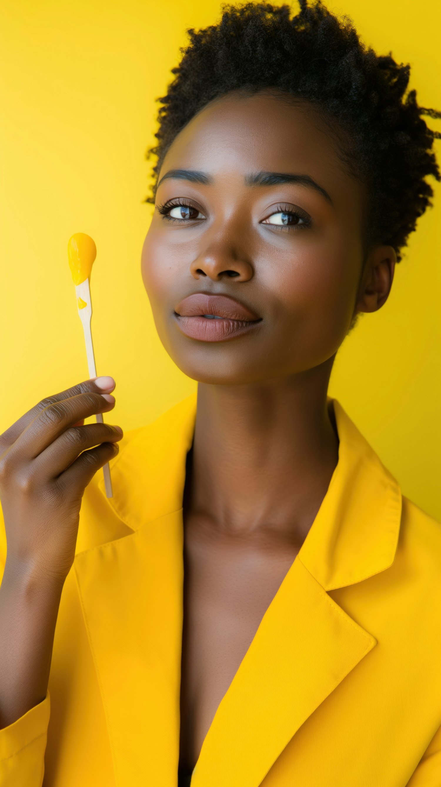 Black woman in yellow jacket holding paint stick against vibrant yellow background, creating a bold and harmonious visual effect.